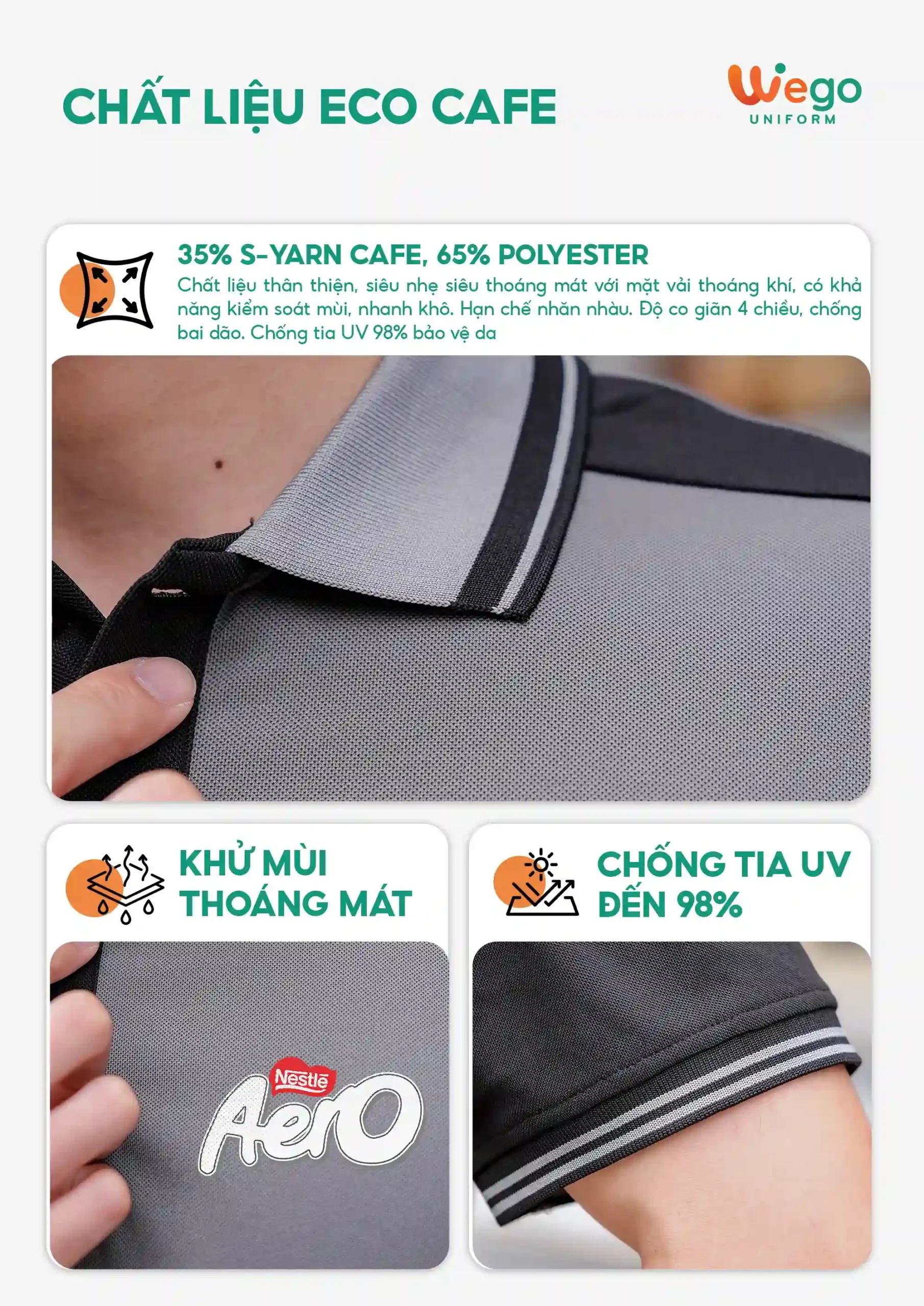 Áo đồng phục Minimal Polo: Màu ghi 02 sử dụng chất liệu Eco Cafe – chất liệu loại vải thân thiện với môi trường, được làm từ 35% S-Cafe Yarn kết hợp với 65% polyester. Dưới đây là một số ưu điểm nổi bật của chất vải này: