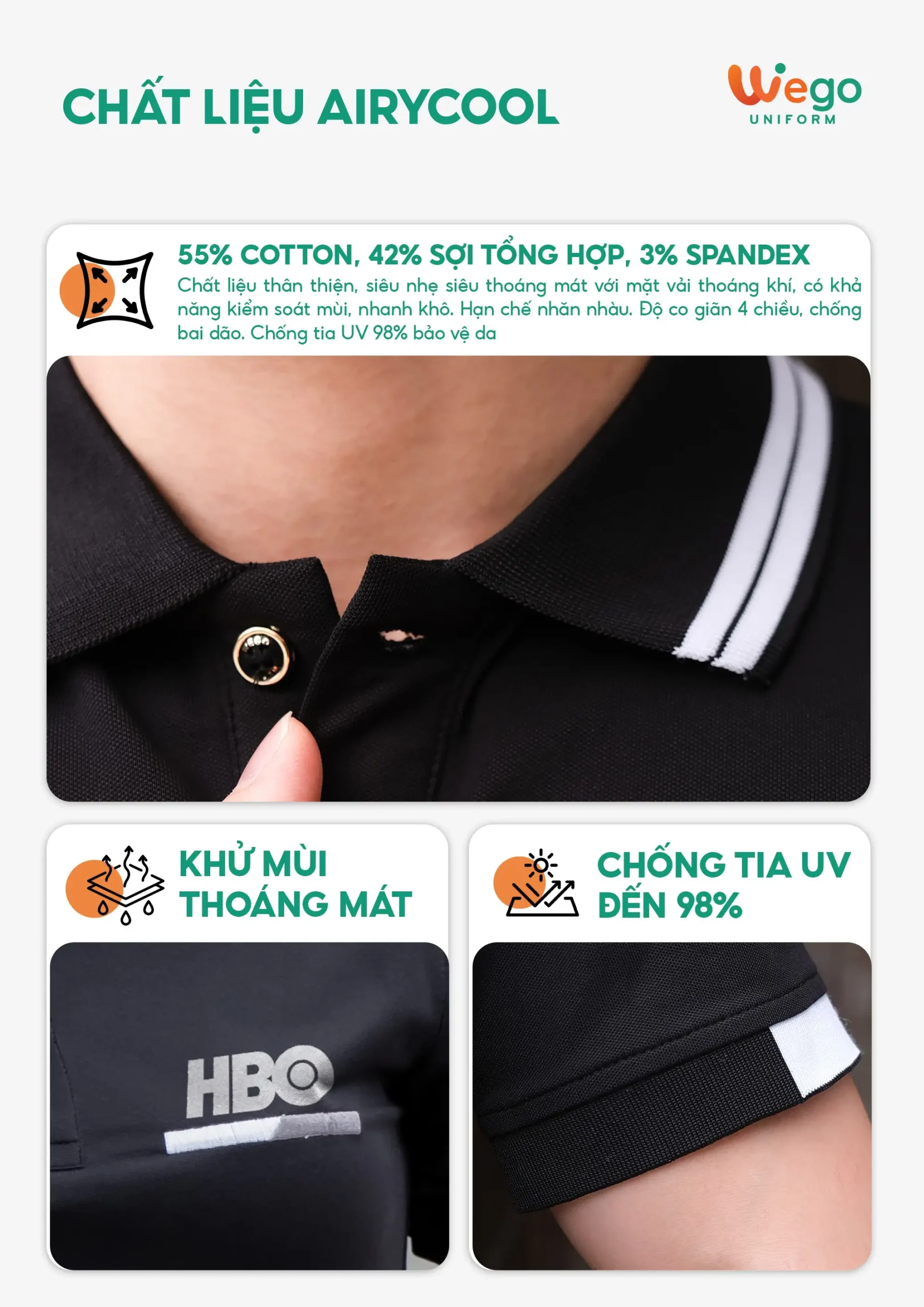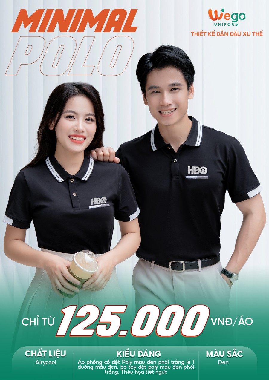 Áo đồng phục Minimal Polo: Màu đen phối thêu họa tiết trên ngực 03 sử dụng chất liệu Airycool – Đây là loại vải đầu tiên trên thế giới được nghiên cứu trong phòng thí nghiệm với thành phần: 55% cotton, 42% Polyester, 3% Spandex.