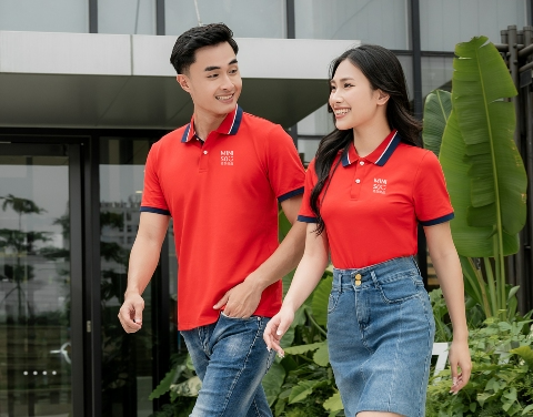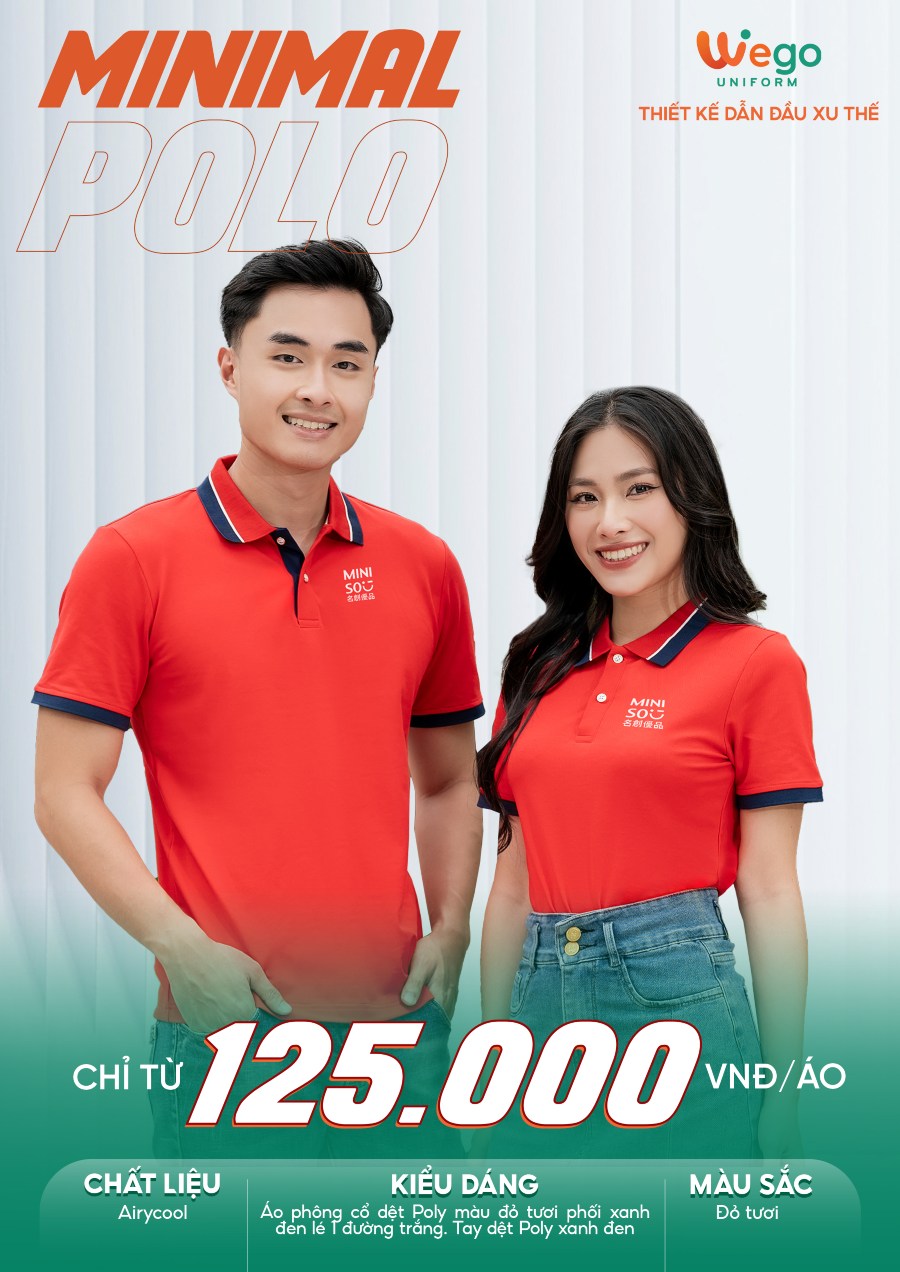 Áo đồng phục Minimal Polo: Màu đỏ tươi phối xanh đen lé 1 đường trắng 01 sử dụng chất liệu Airycool – Đây là loại vải đầu tiên trên thế giới được nghiên cứu trong phòng thí nghiệm với thành phần: 55% cotton, 42% Polyester, 3% Spandex.