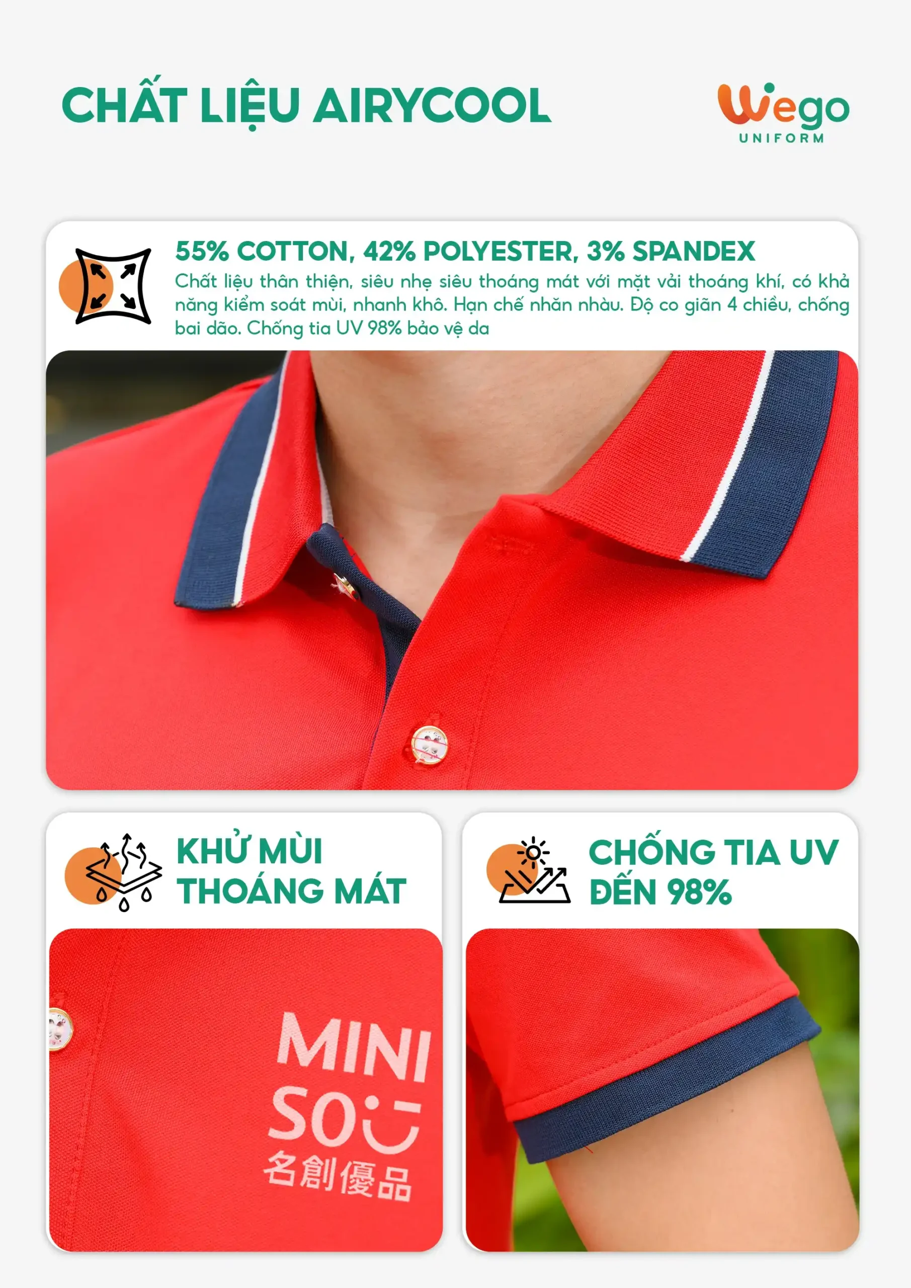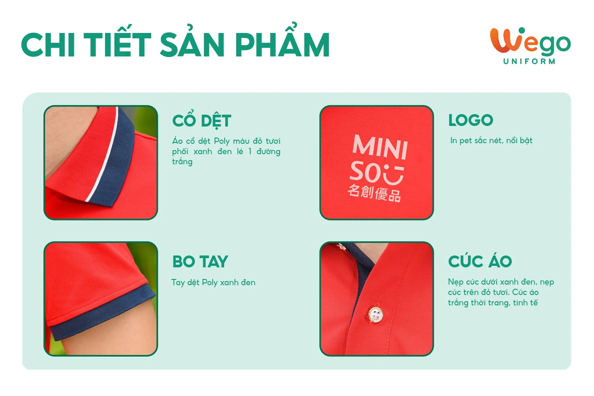 • Được thiết kế độc quyền bởi Wego Uniform, vừa nâng cao tính thời trang, vừa giúp nâng cao nhận diện thương hiệu