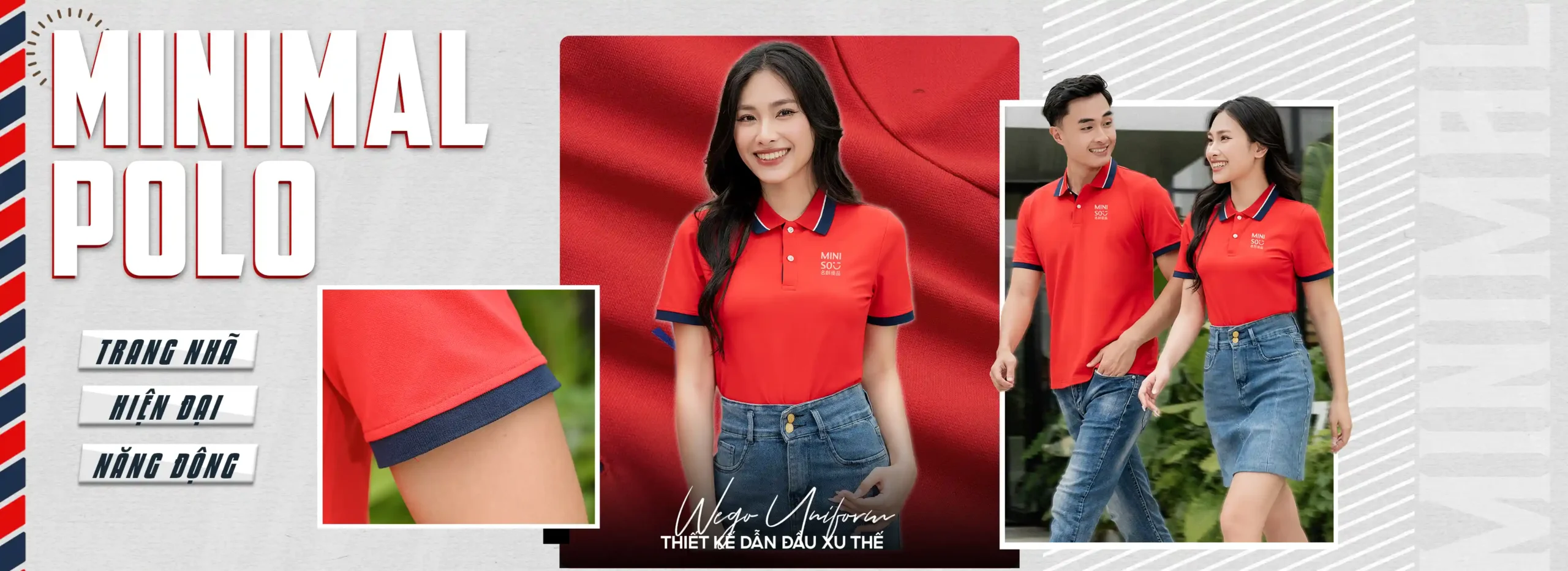 Áo đồng phục Minimal Polo: Màu đỏ tươi phối xanh đen lé 1 đường trắng 01 sử dụng chất liệu Airycool – Đây là loại vải đầu tiên trên thế giới được nghiên cứu trong phòng thí nghiệm với thành phần: 55% cotton, 42% Polyester, 3% Spandex.