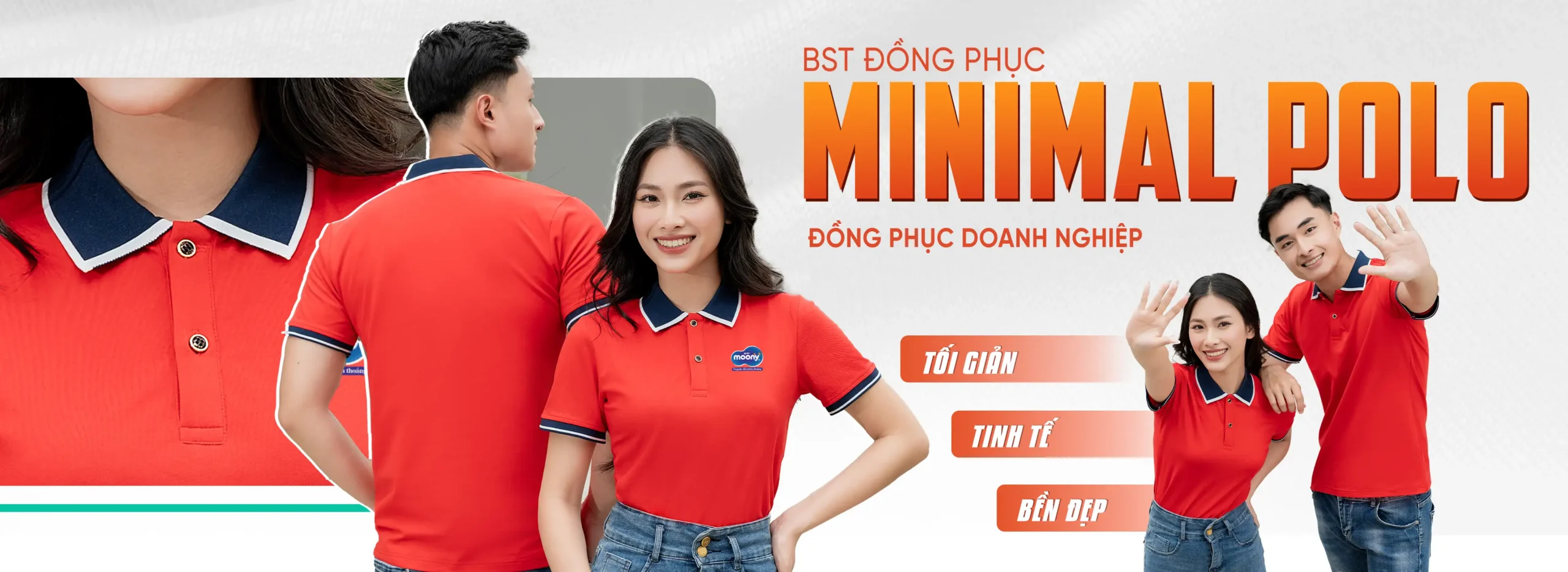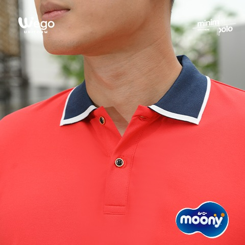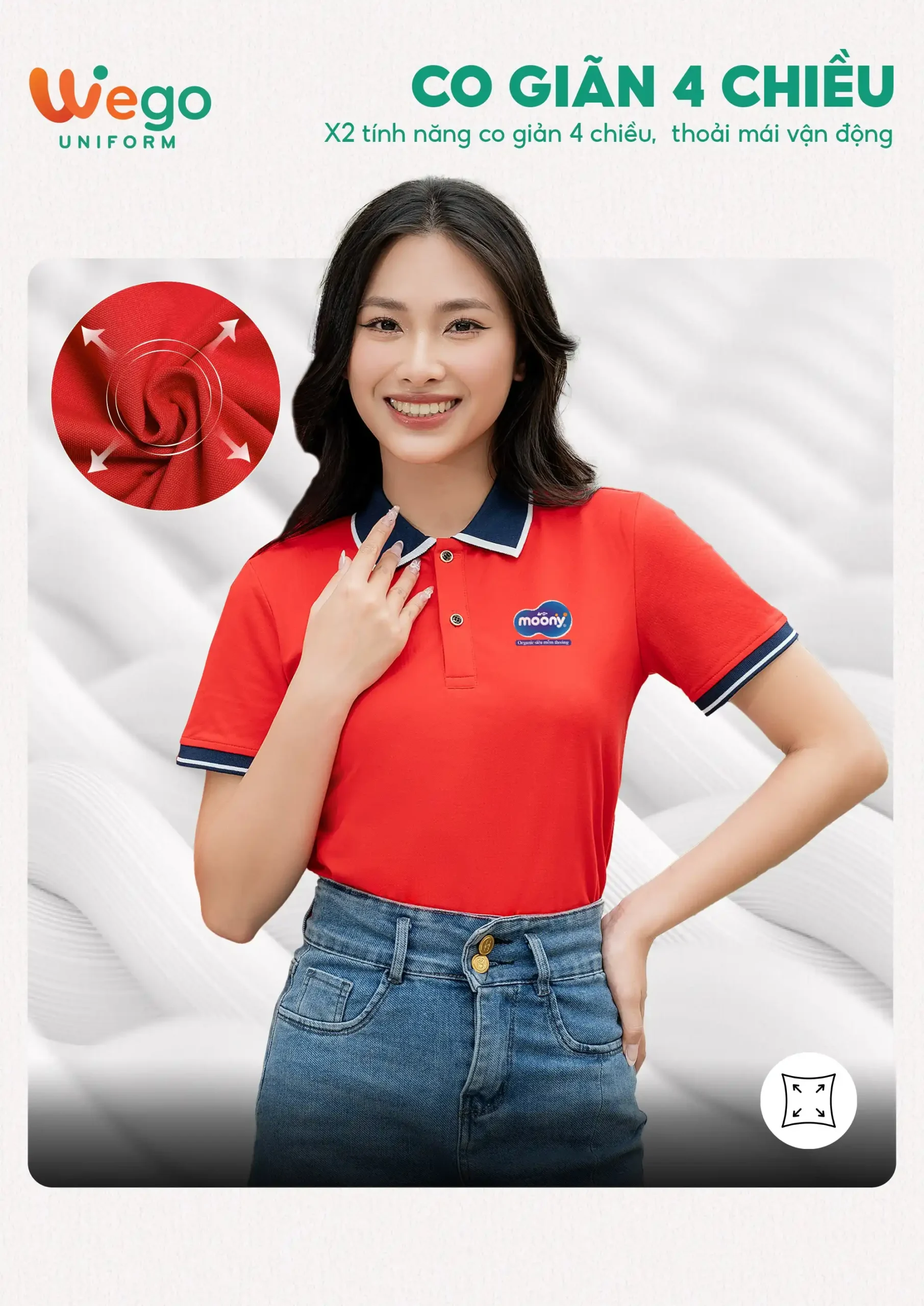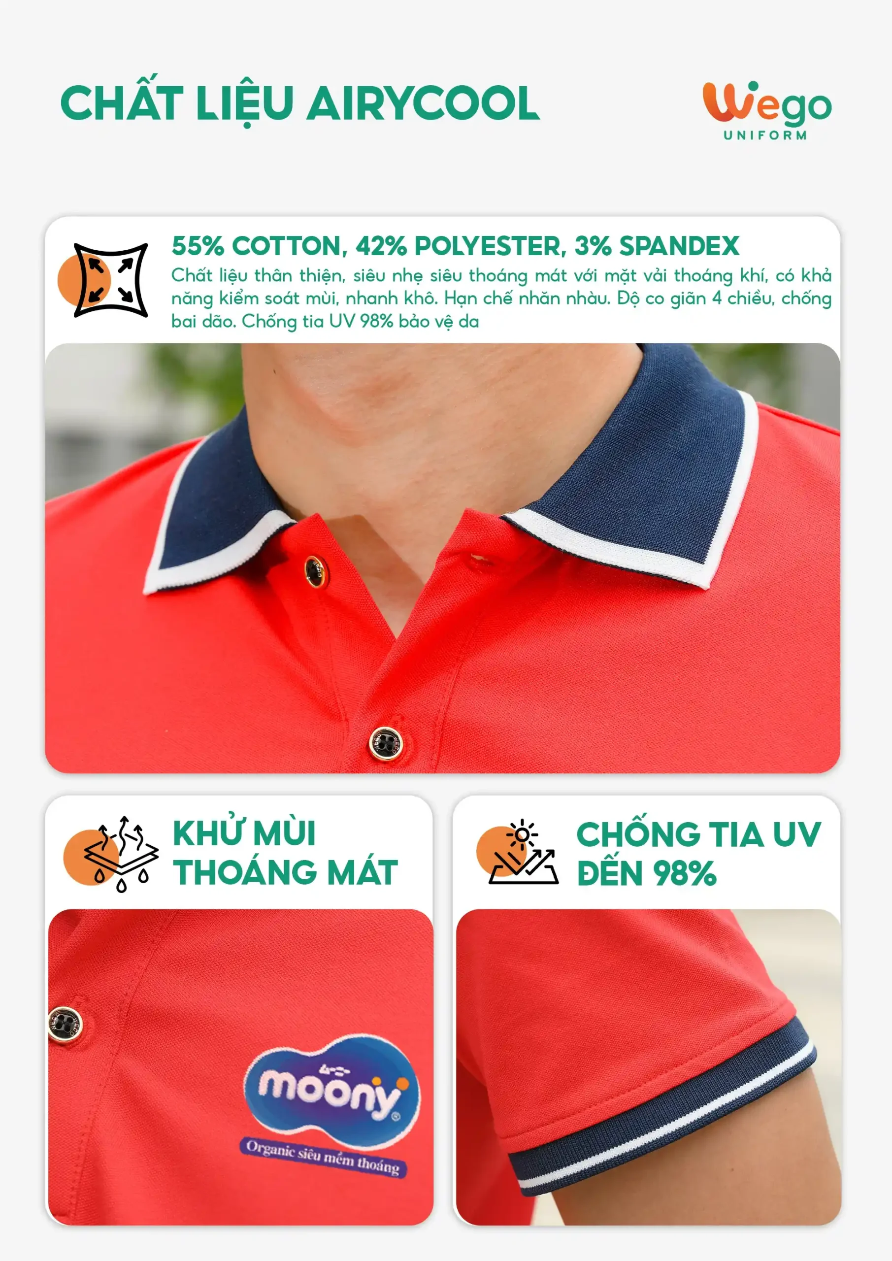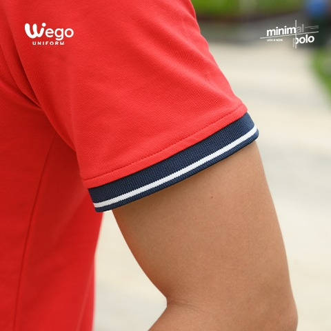 Áo đồng phục Minimal Polo: Màu đỏ tươi cổ dệt xanh đen viền trắng 02 sử dụng chất liệu Airycool – Đây là loại vải đầu tiên trên thế giới được nghiên cứu trong phòng thí nghiệm với thành phần: 55% cotton, 42% Polyester, 3% Spandex.