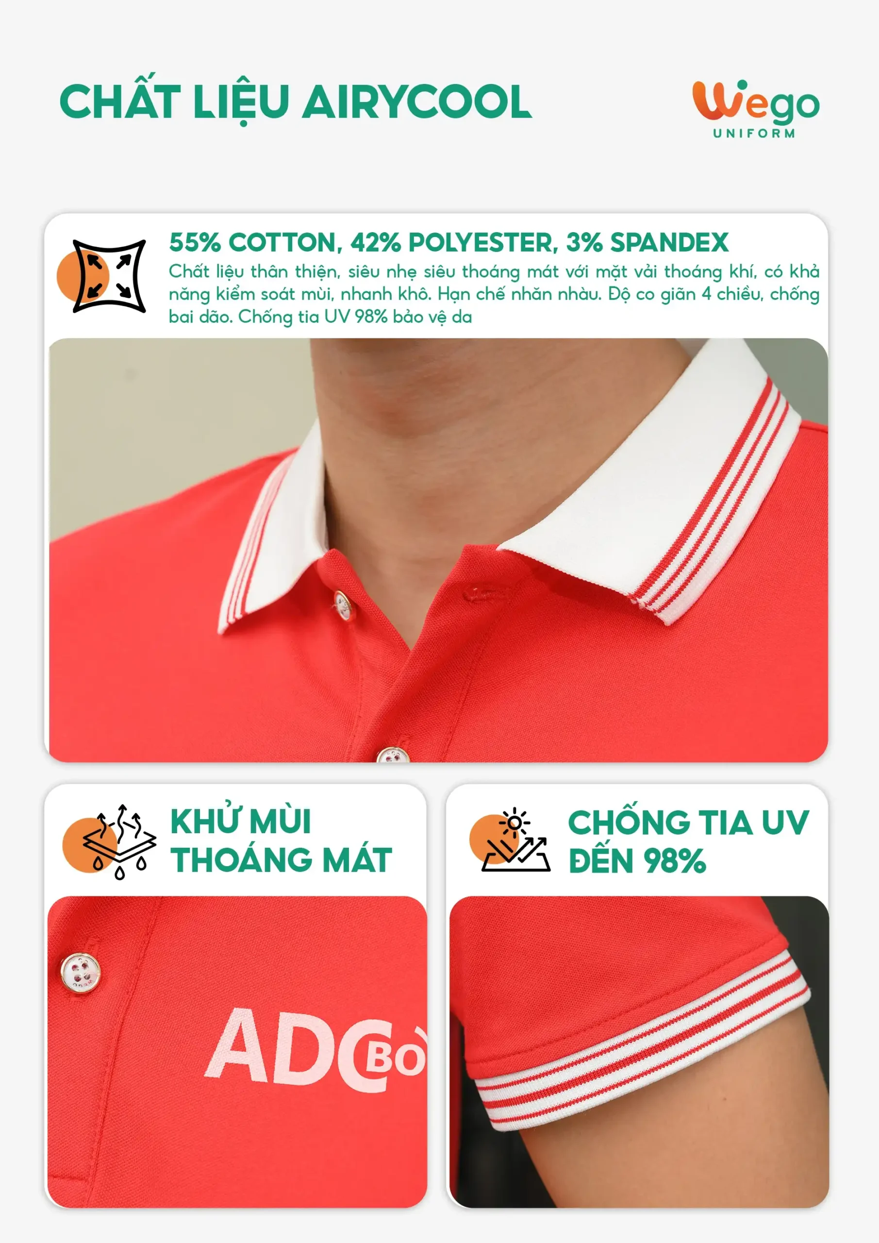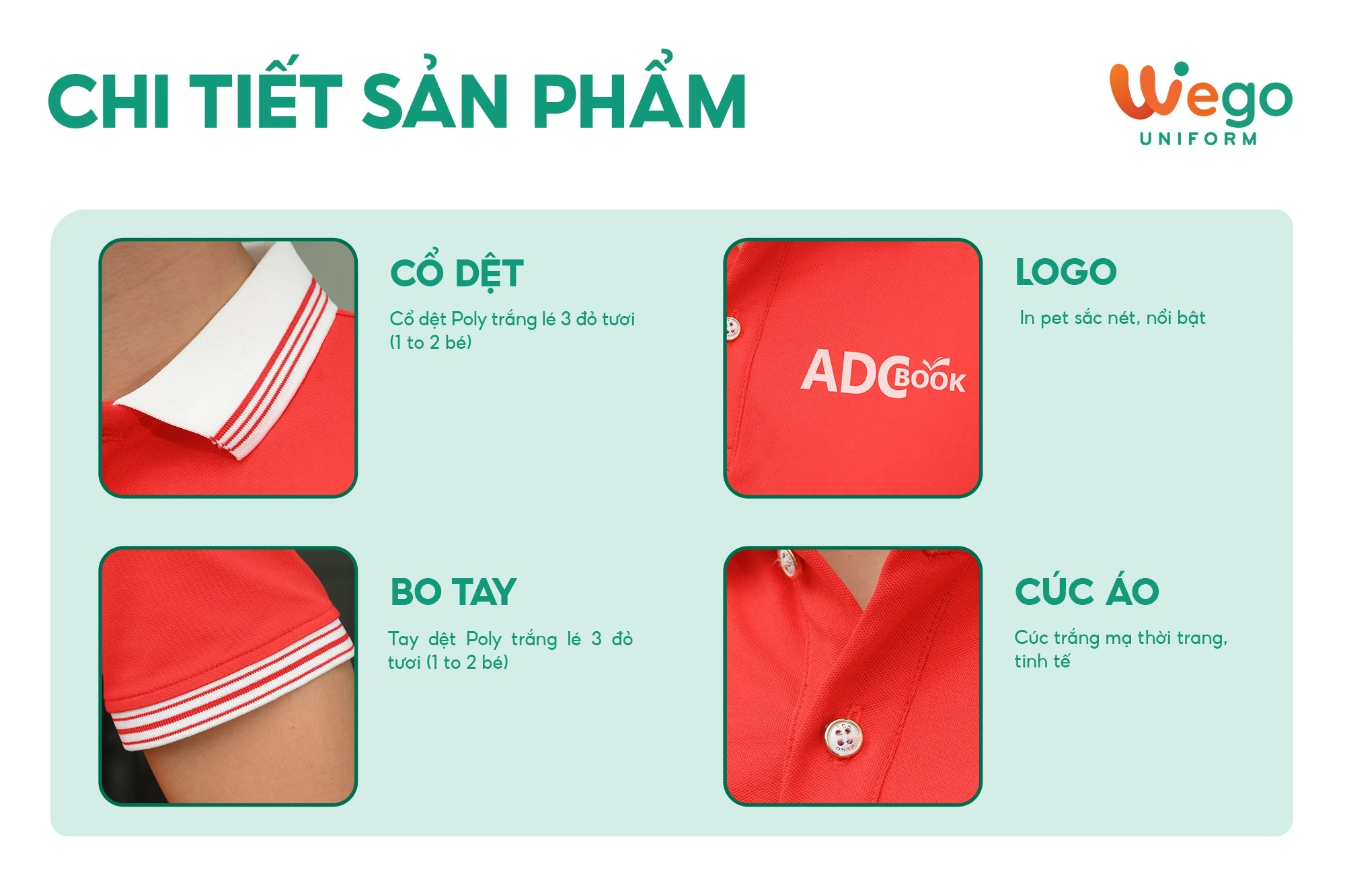 • Được thiết kế độc quyền bởi Wego Uniform, vừa nâng cao tính thời trang, vừa giúp nâng cao nhận diện thương hiệu