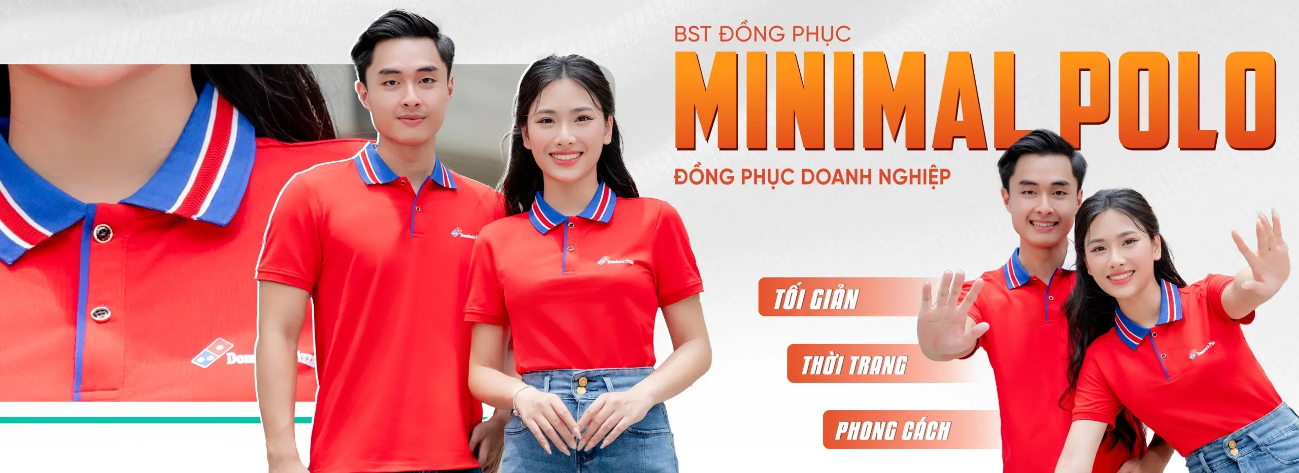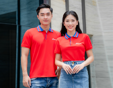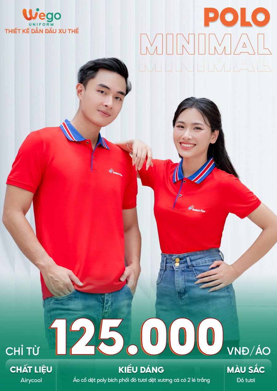 Áo đồng phục Minimal Polo: Màu đỏ tươi cổ dệt xương cá có 2 lé trắng 06 sử dụng chất liệu Airycool – Đây là loại vải đầu tiên trên thế giới được nghiên cứu trong phòng thí nghiệm với thành phần: 55% cotton, 42% Polyester, 3% Spandex.