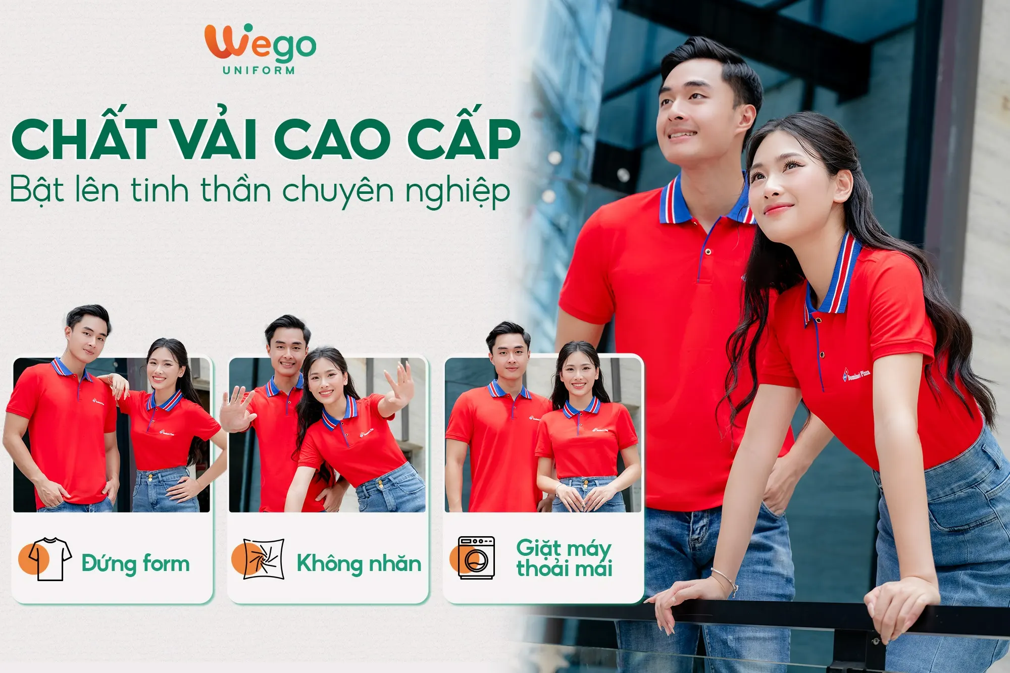 Chính vì vậy, áo đồng phục Wego luôn có độ bền cao, khả năng co giãn và thoáng khí tốt. Từ đó mang lại sự thoải mái tối đa cho người mặc, ngay cả trong thời tiết nắng nóng hay những môi trường làm việc đòi hỏi vận động nhiều hoặc trong thời gian dài.