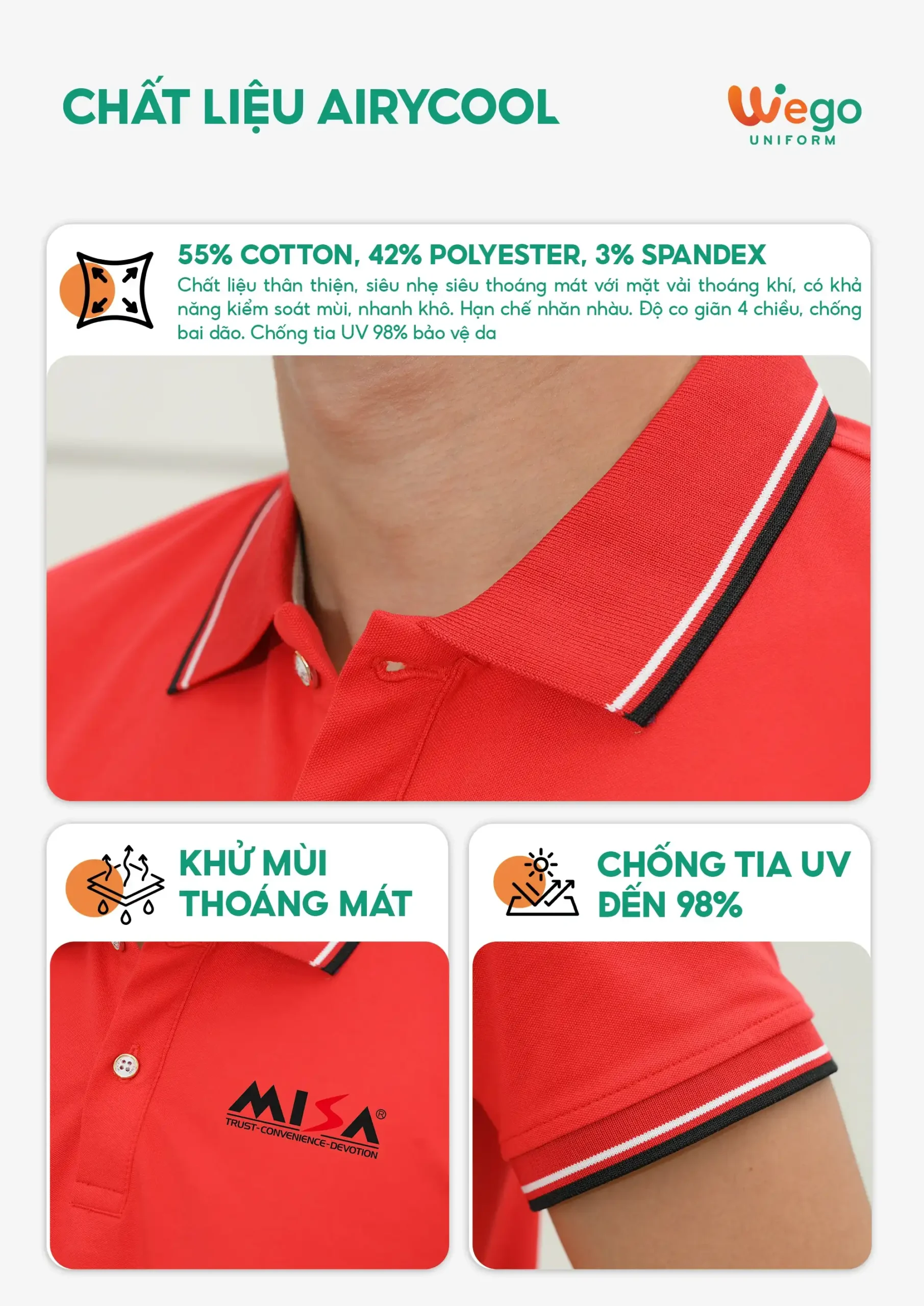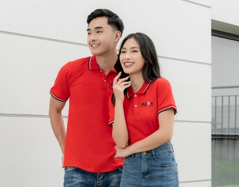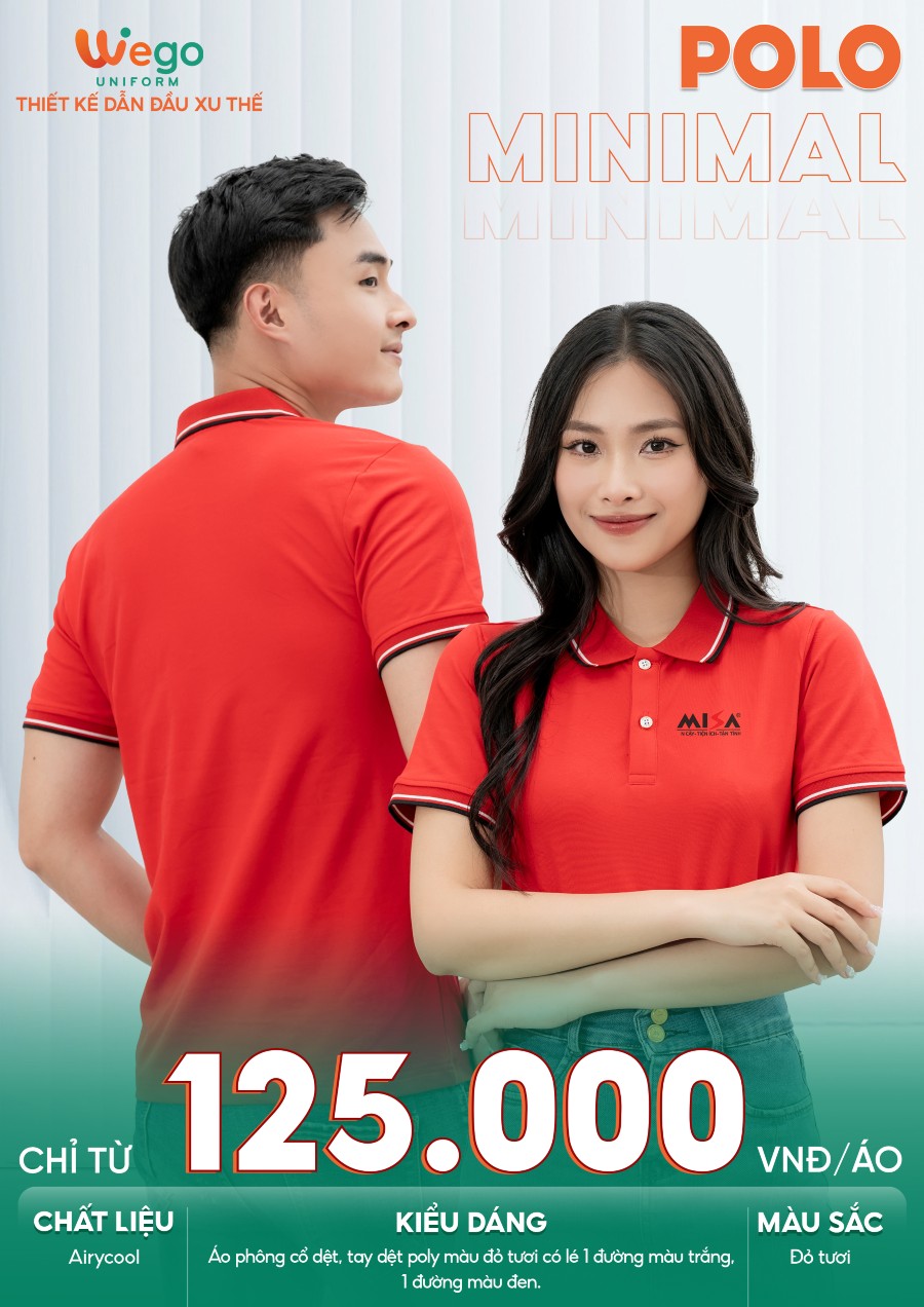 Áo đồng phục Minimal Polo: Màu đỏ tươi có lé 1 đường màu trắng 05 sử dụng chất liệu Airycool – Đây là loại vải đầu tiên trên thế giới được nghiên cứu trong phòng thí nghiệm với thành phần: 55% cotton, 42% Polyester, 3% Spandex.
