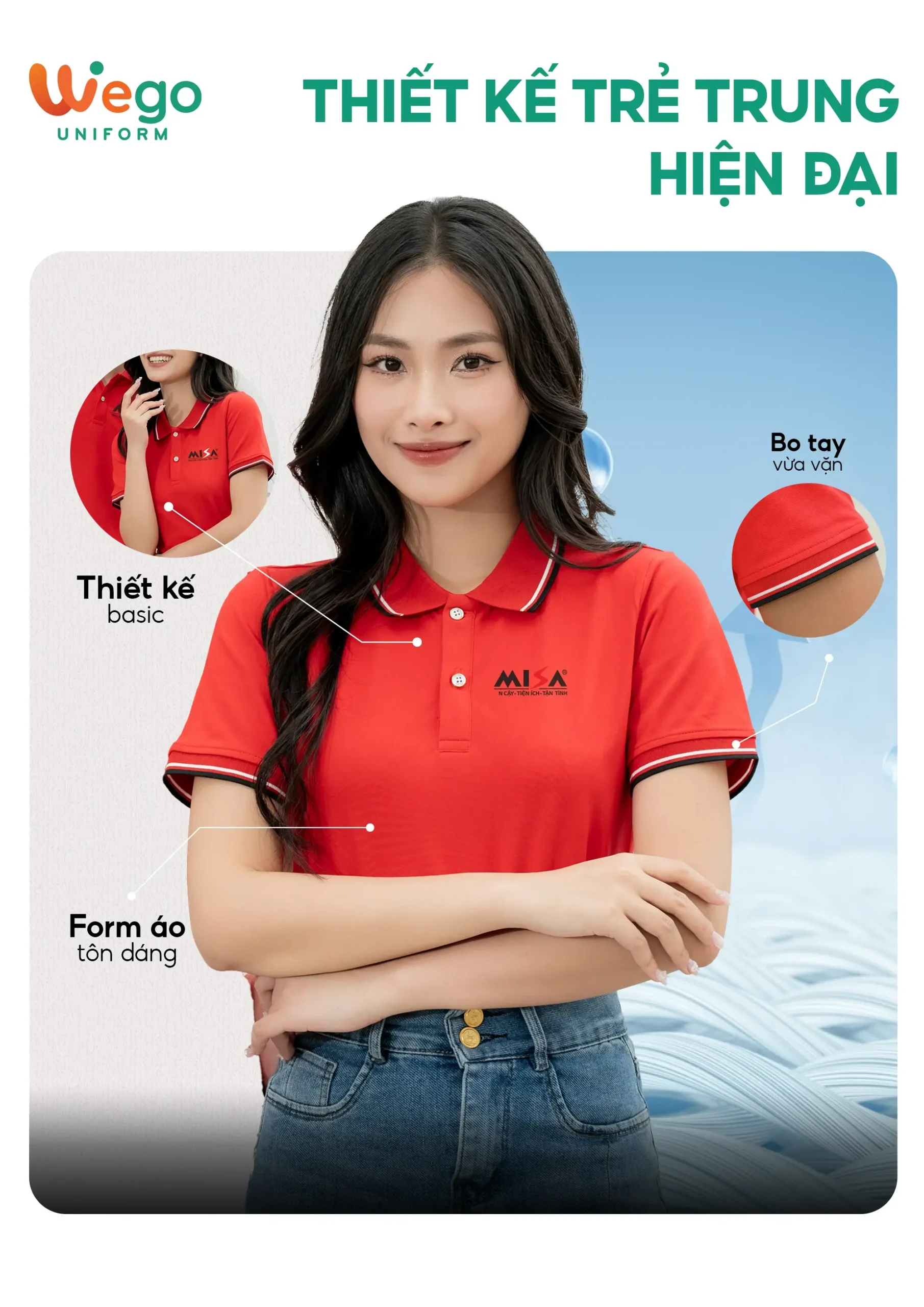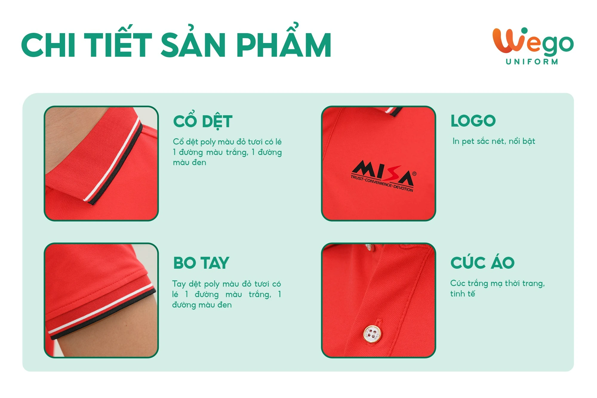 • Được thiết kế độc quyền bởi Wego Uniform, vừa nâng cao tính thời trang, vừa giúp nâng cao nhận diện thương hiệu