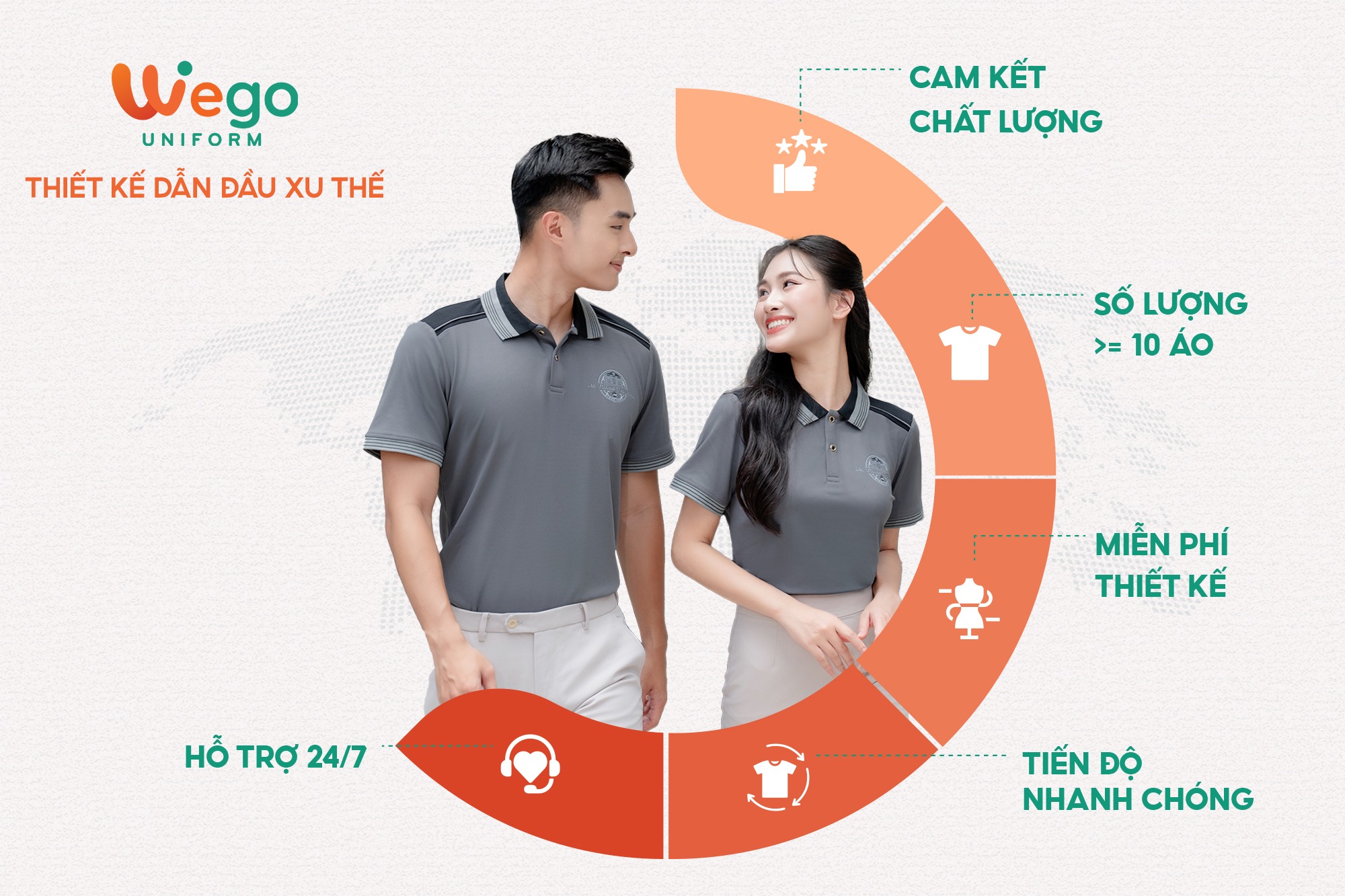 Với nhiều năm kinh nghiệm trong ngành sản xuất đồng phục, Wego tự hào là đơn vị dẫn đầu trong lĩnh vực đồng phục, trở thành đối tác đáng tin cậy của nhiều doanh nghiệp, tổ chức và cá nhân trên cả nước.