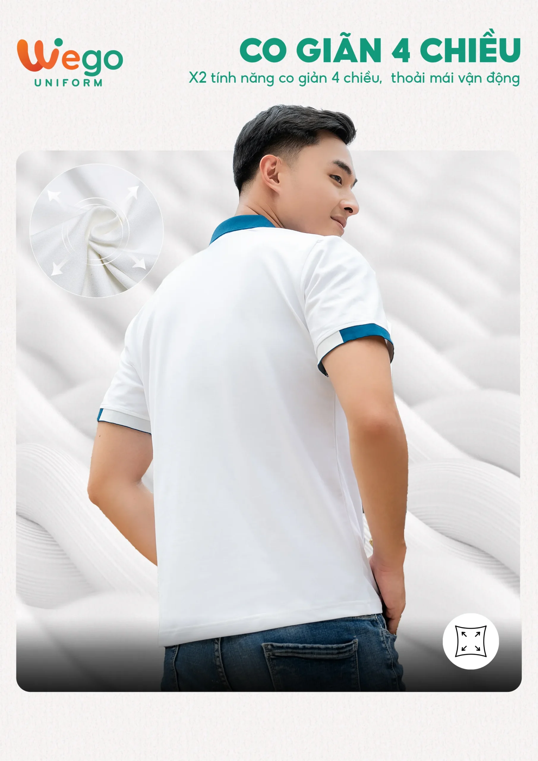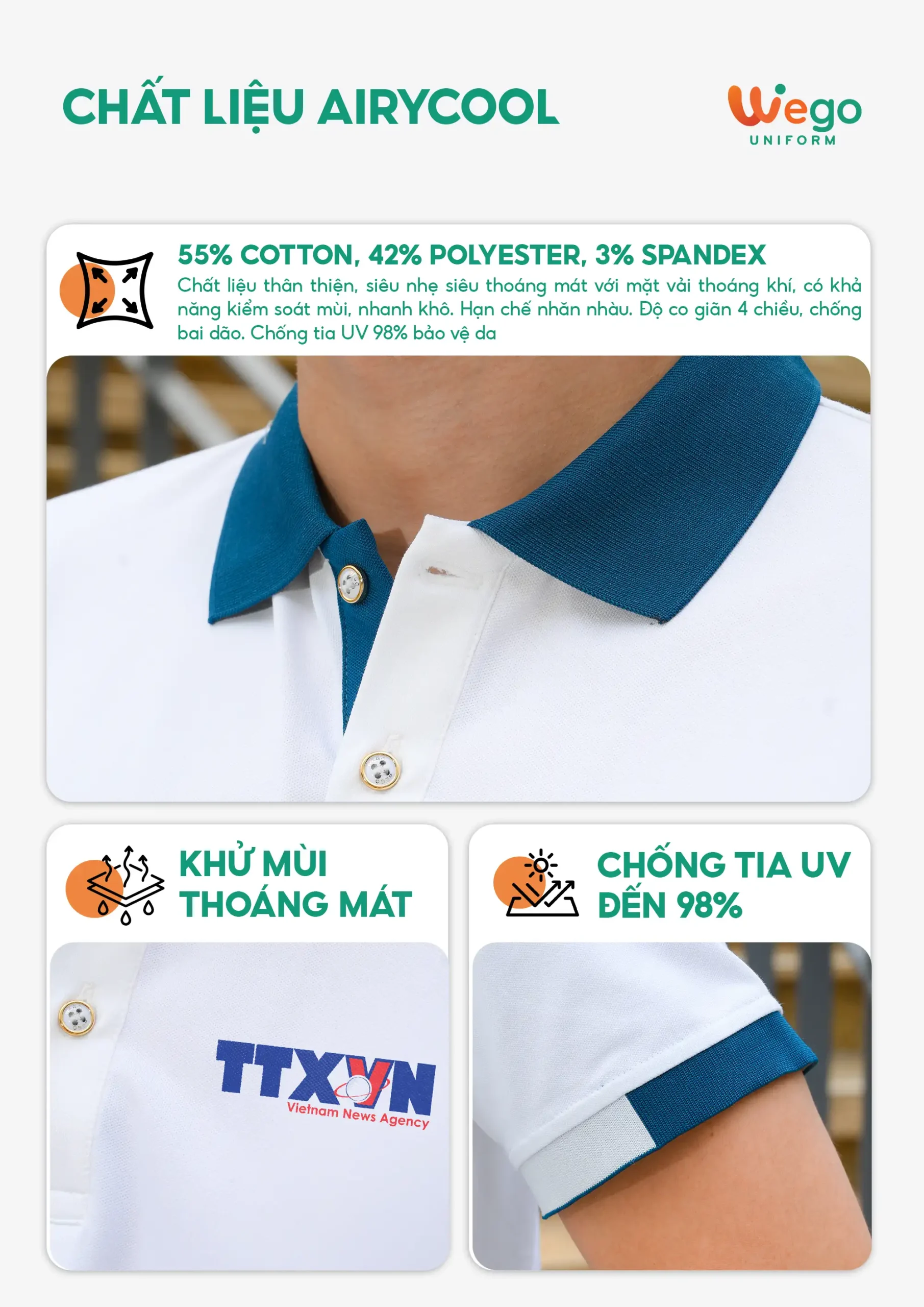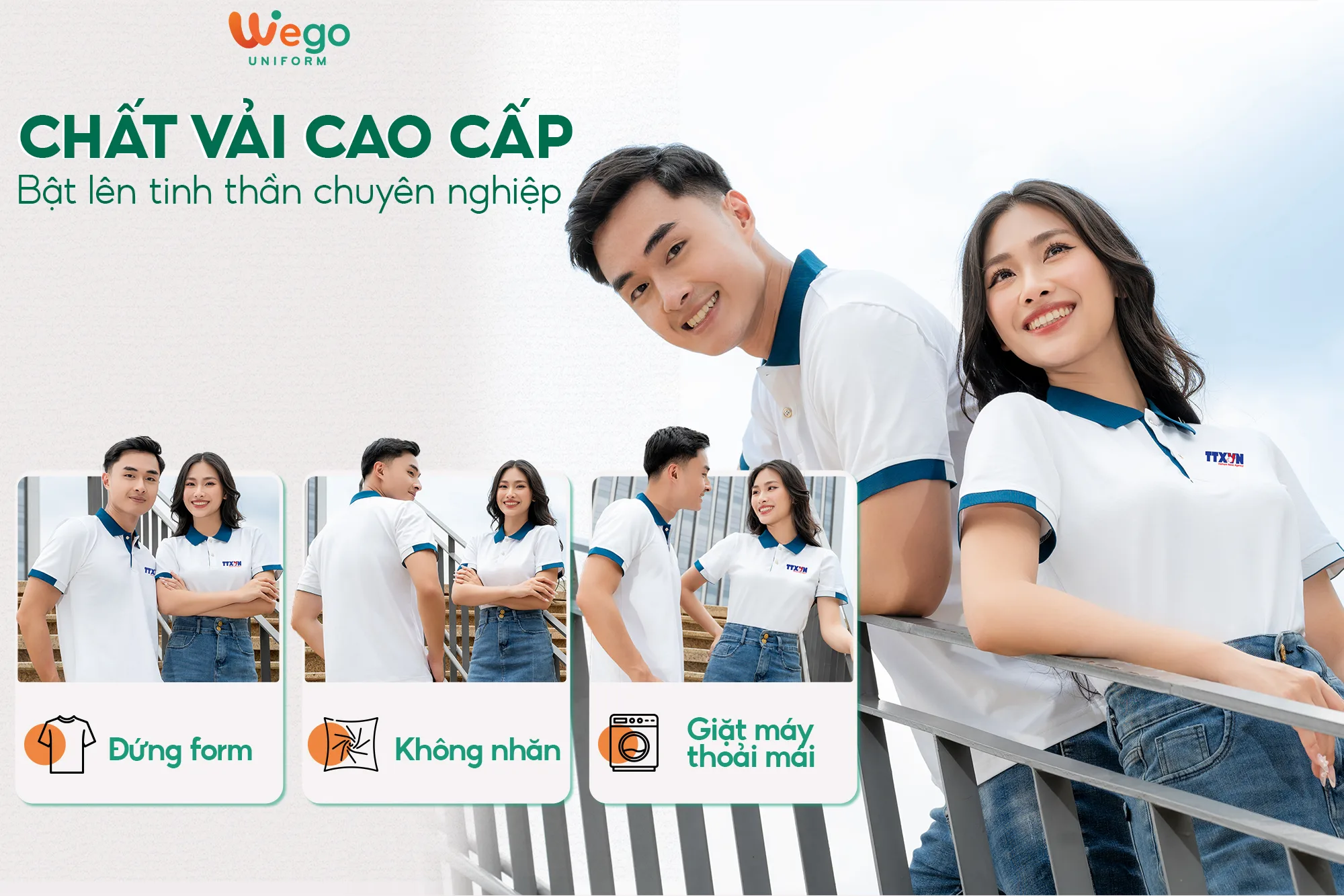 Chính vì vậy, áo đồng phục Wego luôn có độ bền cao, khả năng co giãn và thoáng khí tốt. Từ đó mang lại sự thoải mái tối đa cho người mặc, ngay cả trong thời tiết nắng nóng hay những môi trường làm việc đòi hỏi vận động nhiều hoặc trong thời gian dài.