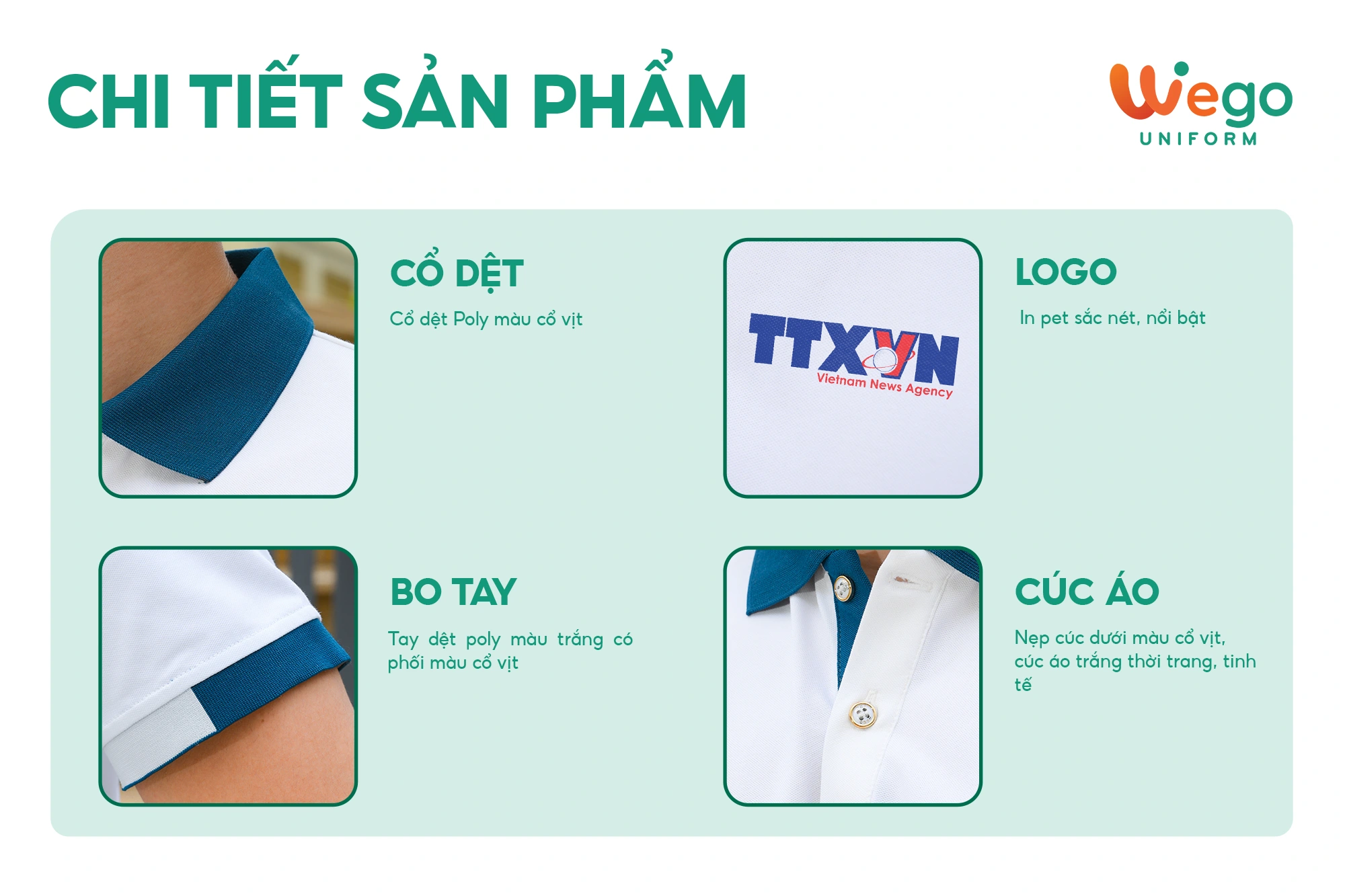 - Được thiết kế độc quyền bởi Wego Uniform, vừa nâng cao tính thời trang, vừa giúp nâng cao nhận diện thương hiệu