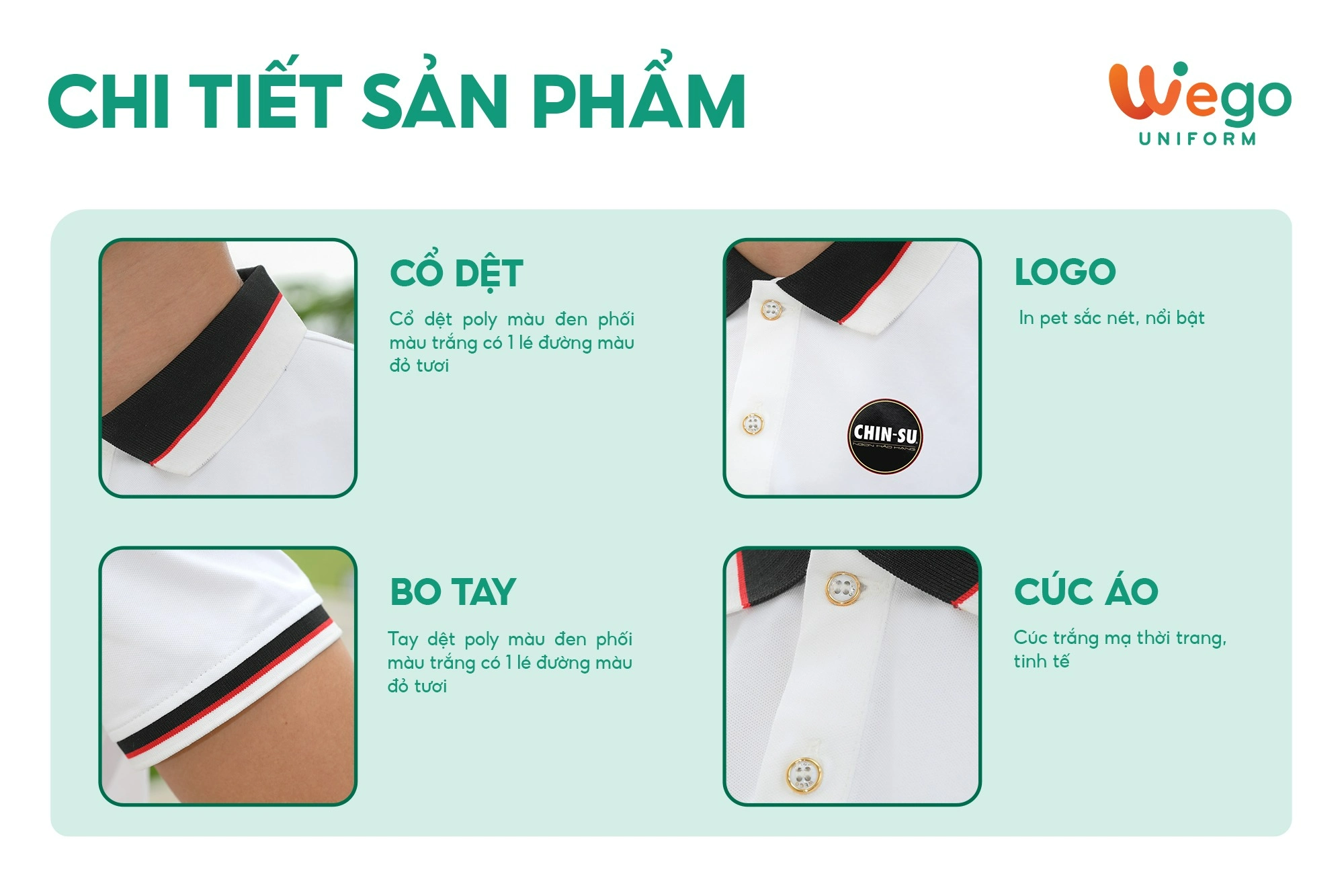 - Được thiết kế độc quyền bởi Wego Uniform, vừa nâng cao tính thời trang, vừa giúp nâng cao nhận diện thương hiệu