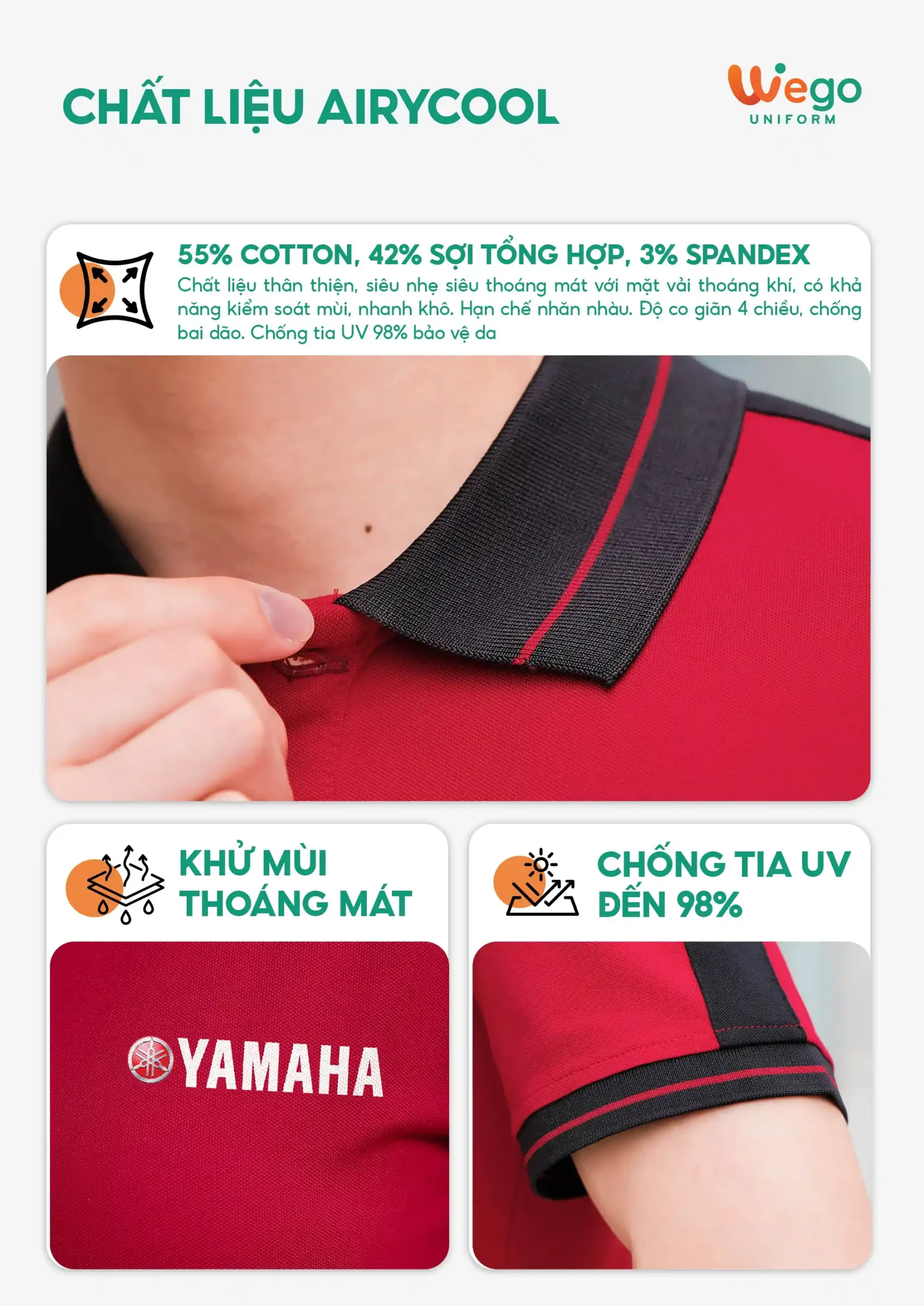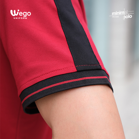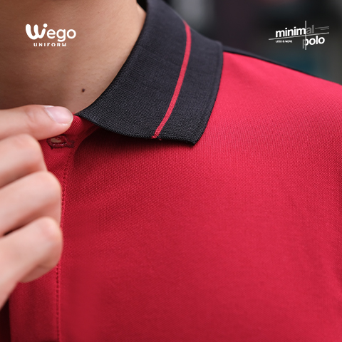 Áo đồng phục Minimal Polo: Màu đỏ đô phối đen 01 sử dụng chất liệu Airycool – Đây là loại vải đầu tiên trên thế giới được nghiên cứu trong phòng thí nghiệm với thành phần: 55% cotton, 42% Polyester, 3% Spandex.