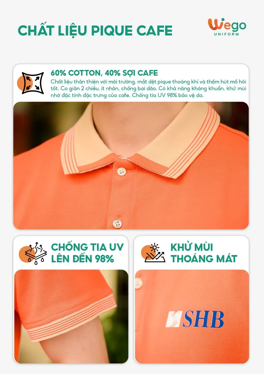 Áo đồng phục Pique Cafe: Màu vàng mía cổ dệt vàng mía có 1 lé trắng nhỏ sử dụng chất liệu Pique Cafe – Đây là loại vải độc quyền tại Wego Uniform với thành phần: 60% Cotton, 40% sợi Cafe.