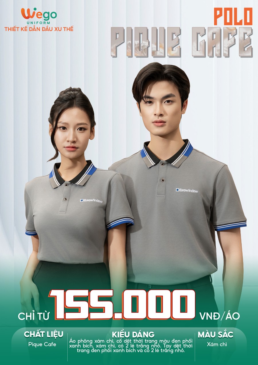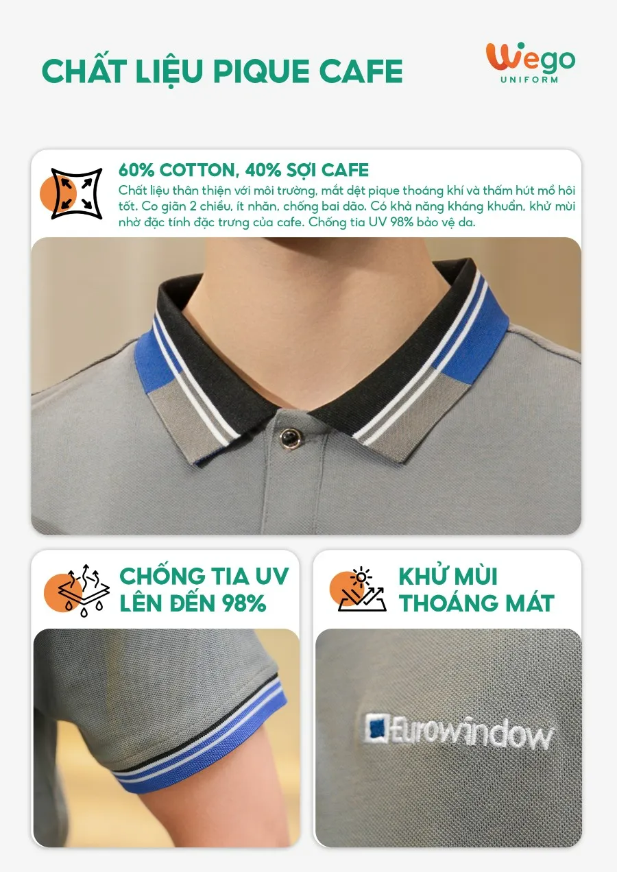 Áo đồng phục Pique Cafe: Màu xám chì cổ màu đen phối xanh bích có 2 lé trắng nhỏ sử dụng chất liệu Pique Cafe – Đây là loại vải độc quyền tại Wego Uniform với thành phần: 60% Cotton, 40% sợi Cafe.