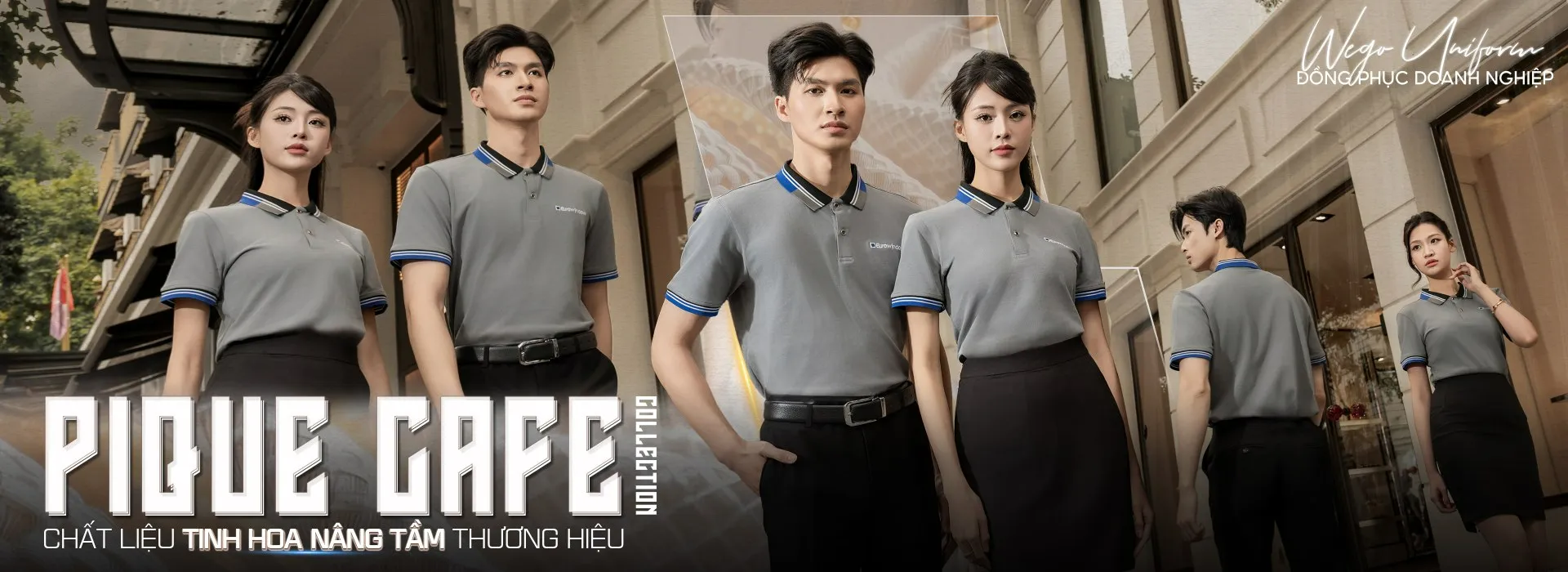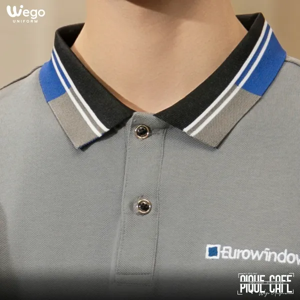 Áo đồng phục Pique Cafe: Màu xám chì cổ màu đen phối xanh bích có 2 lé trắng nhỏ sử dụng chất liệu Pique Cafe – Đây là loại vải độc quyền tại Wego Uniform với thành phần: 60% Cotton, 40% sợi Cafe.