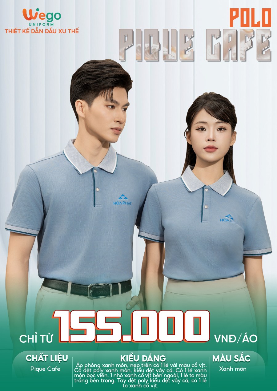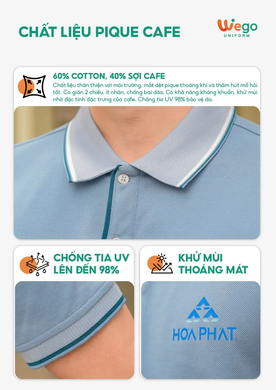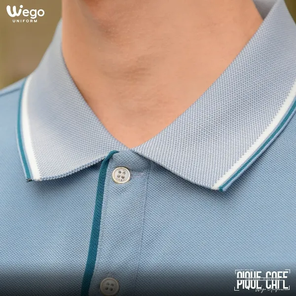 Áo thun phông đồng phục Pique Cafe: Màu xanh môn cổ dệt poly màu xanh môn kiểu dệt vảy cá sử dụng chất liệu Pique Cafe – Đây là loại vải độc quyền tại Wego Uniform với thành phần: 60% Cotton, 40% sợi Cafe.