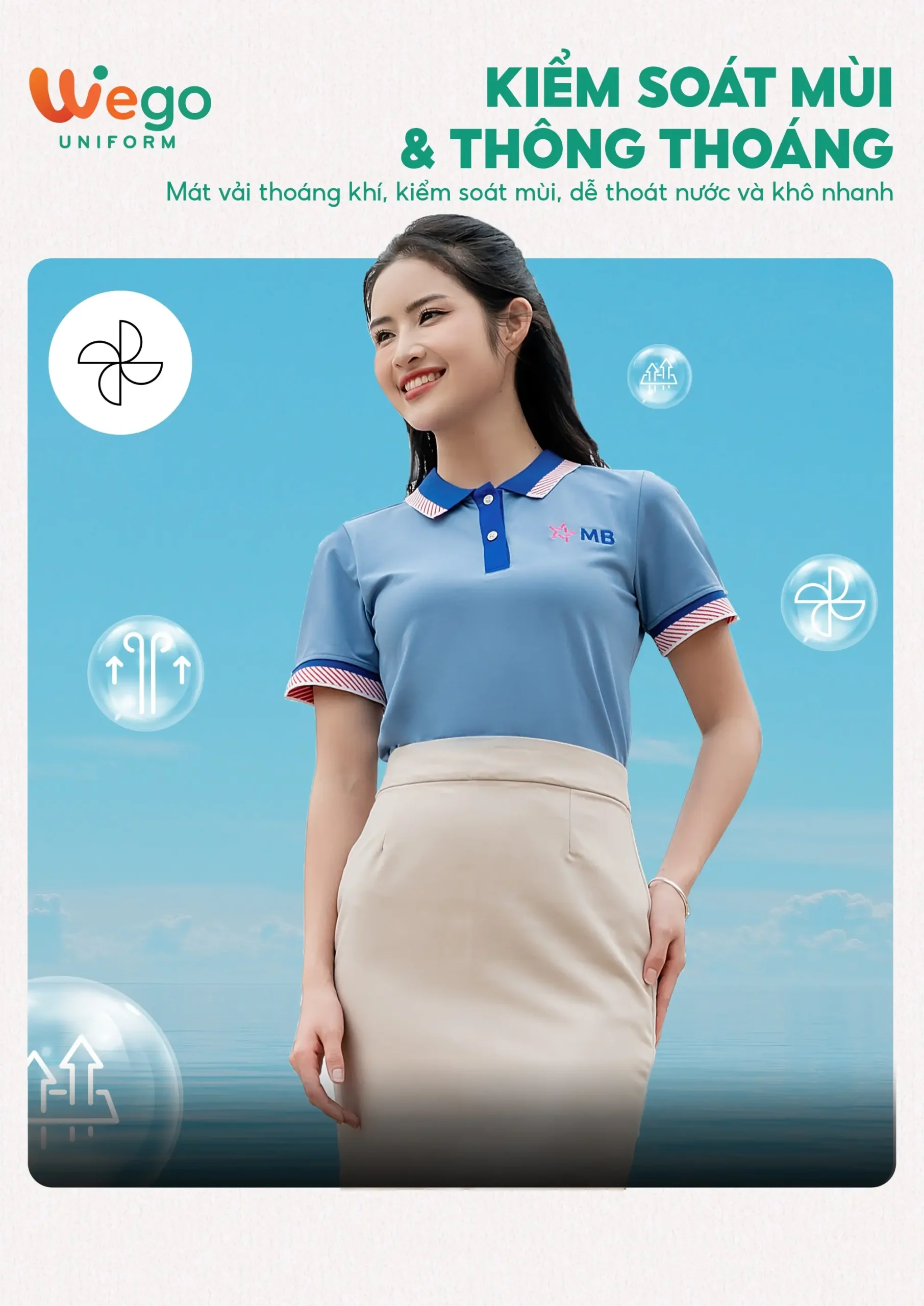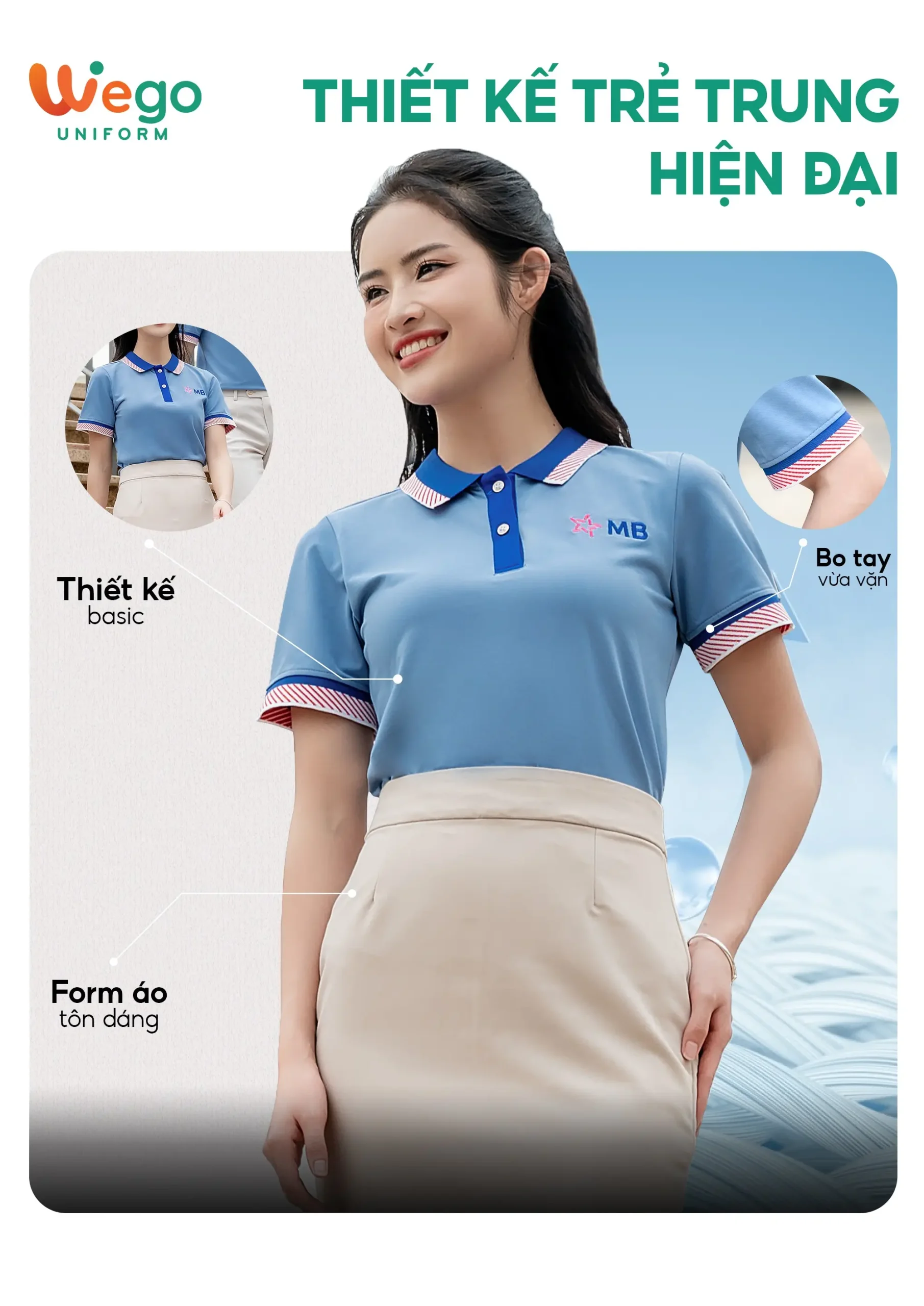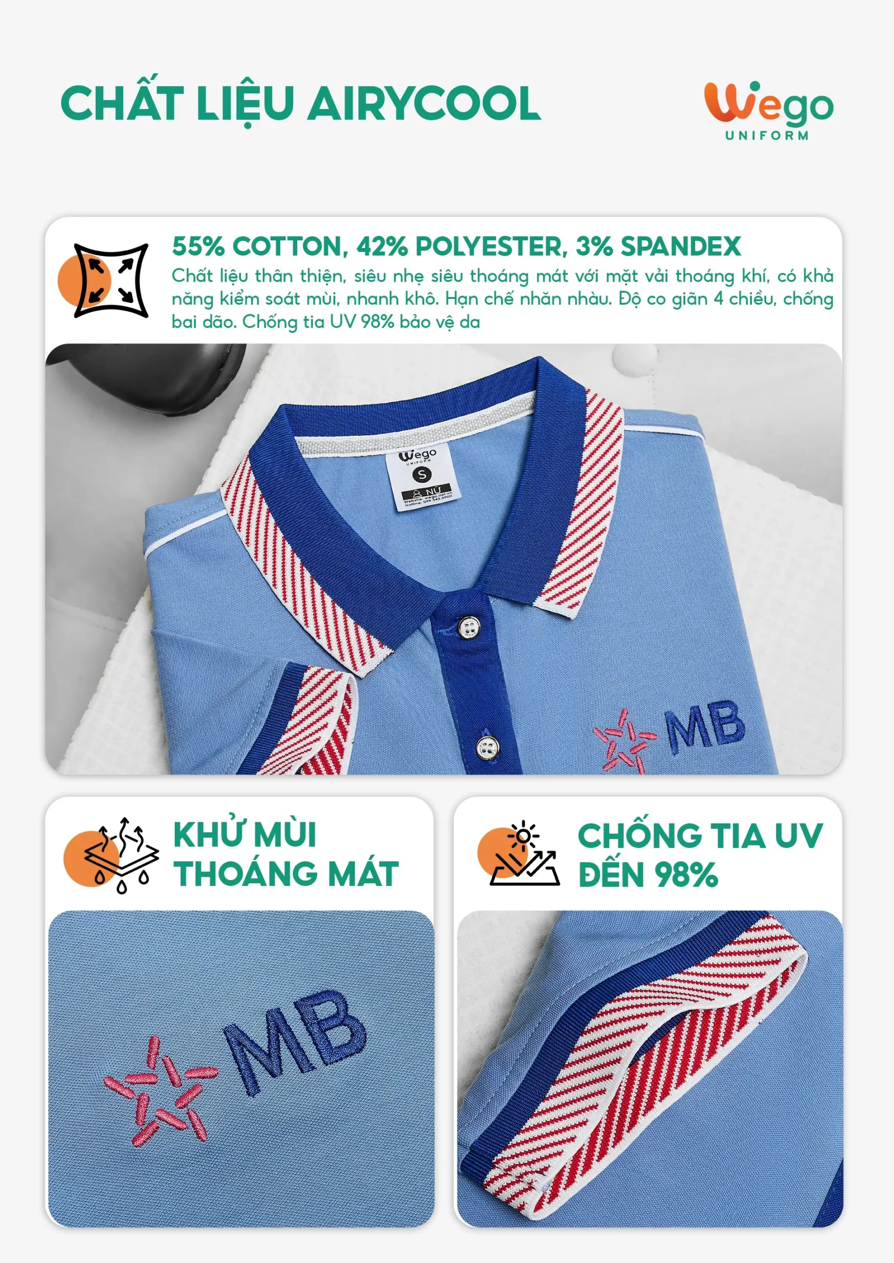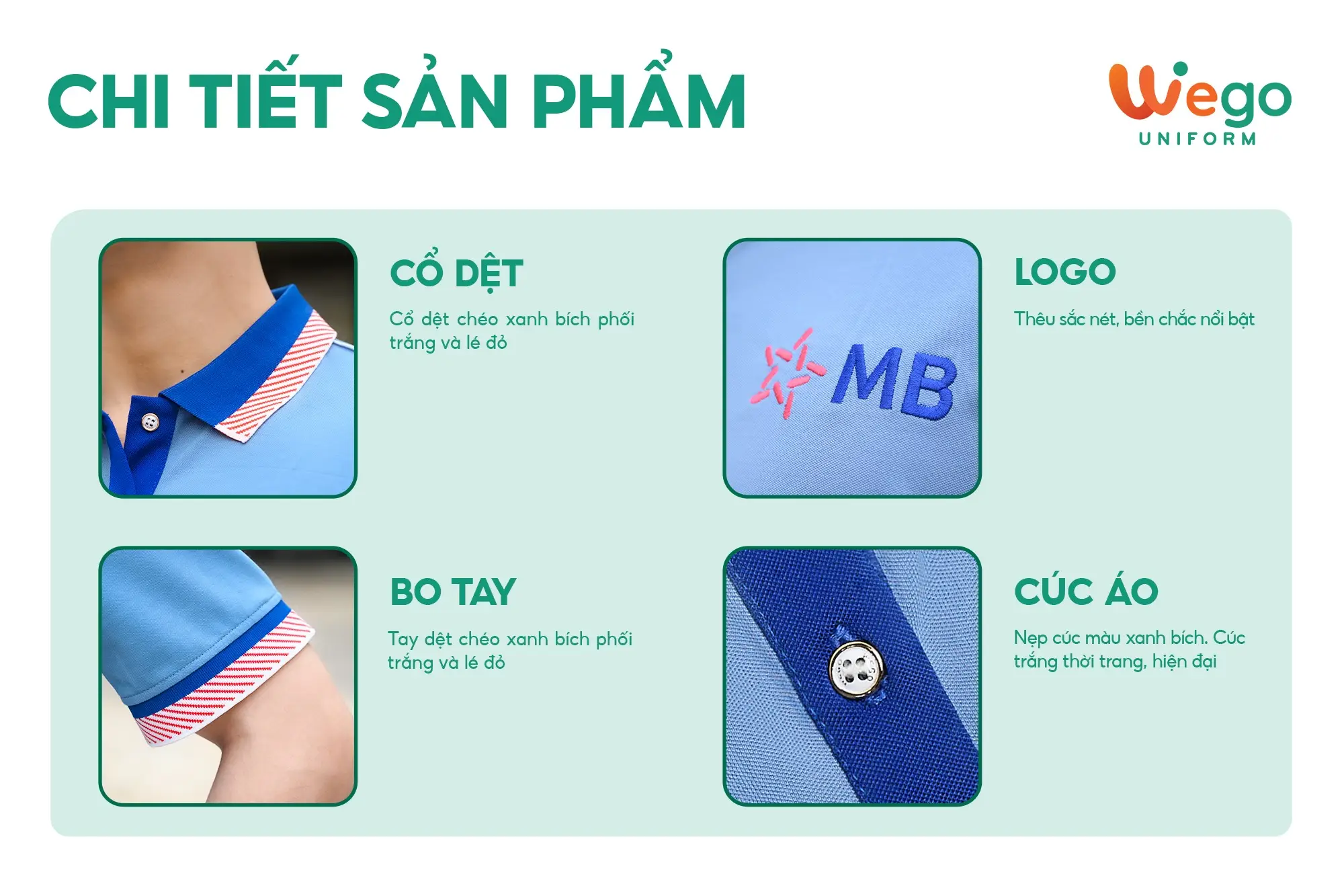 - Được thiết kế độc quyền bởi Wego Uniform, vừa nâng cao tính thời trang, vừa giúp nâng cao nhận diện thương hiệu