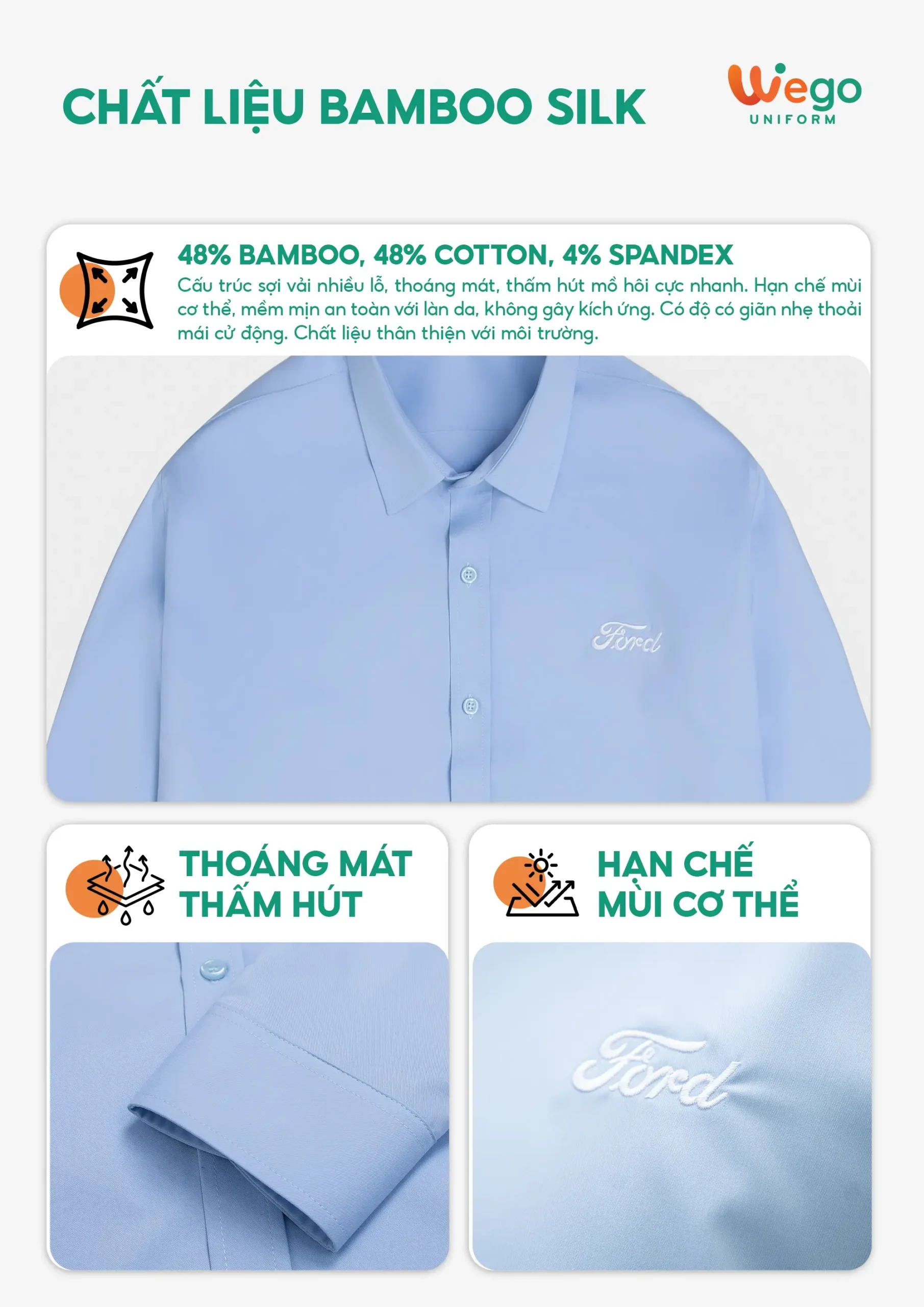 Đồng phục áo sơ mi ES04 sử dụng chất liệu kết hợp giữa vải Bamboo silk với sợi vải khuynh diệp, sở hữu những ưu điểm nổi bật như: