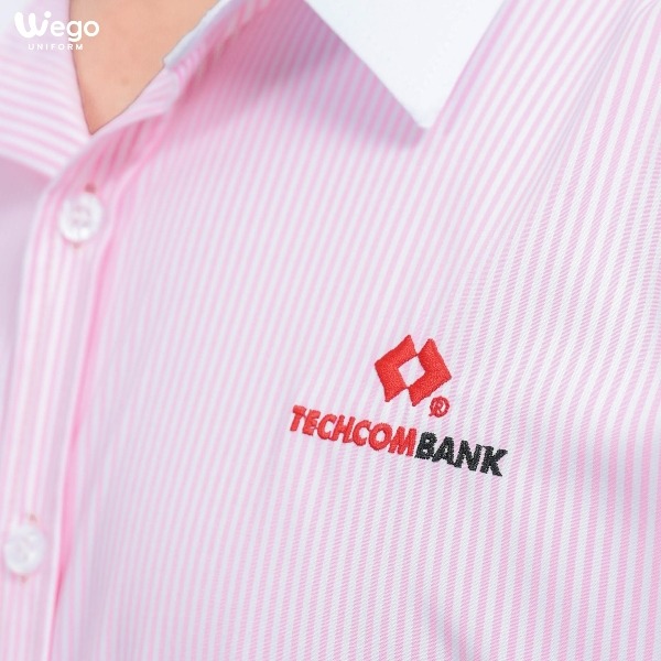 Mẫu đồng phục sơ mi được thiết kế theo logo thương hiệu Techcombank, sử dụng các đường kẻ trắng hồng làm chủ đạo.