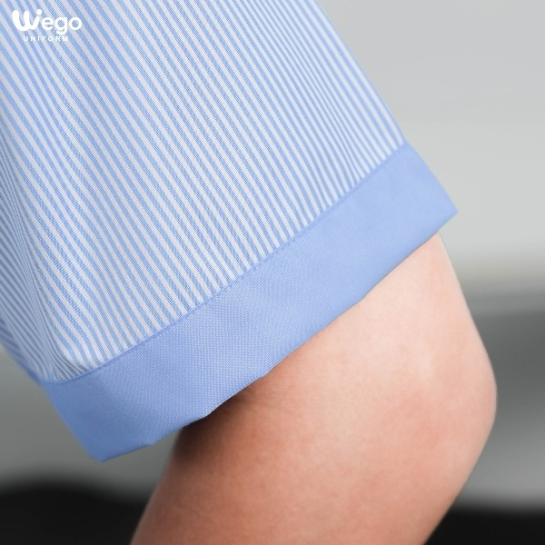 Áo nữ: Sơ mi nữ slimfit tay cộc, lá cổ trắng phối 1,2cm xanh ở đầu lá cổ. Cửa tay phối 1,5cm xanh. Cúc trong suốt màu trắng.