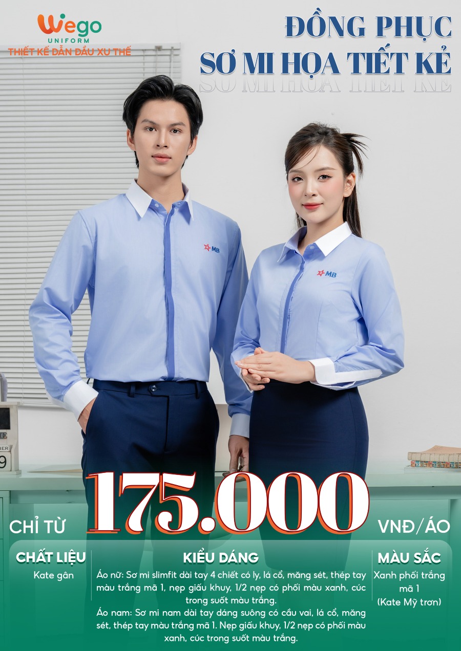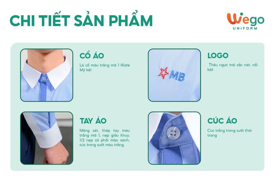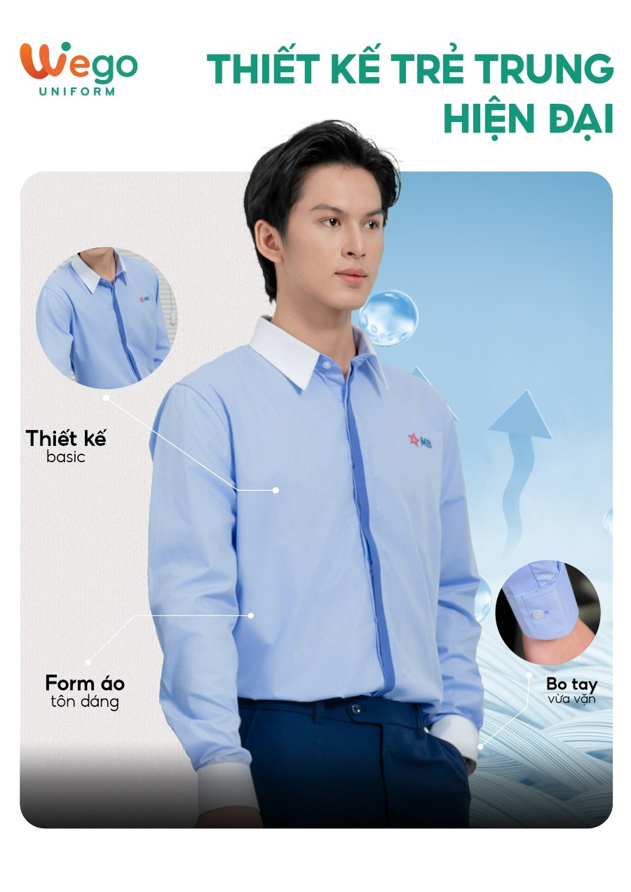 Đồng phục Sơ mi màu xanh phối trắng MB đang trở thành tâm điểm trong bộ sưu tập đồng phục áo sơ mi họa tiết kẻ mới nhất của Wego. Bộ sưu tập lần này sở hữu các mẫu đồng phục áo sơ mi vừa hiện đại, tinh tế, thời trang lại vừa mang xu hướng thân thiện với môi trường. Wego đề cao sự tối giản trong từng thiết kế, chú trọng vào chất lượng sản phẩm nhằm đem lại sự thoải mái, dễ chịu cho người mặc.