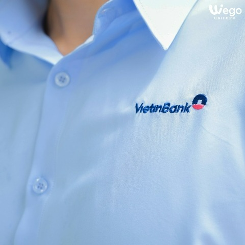 Mẫu đồng phục sơ mi được thiết kế theo logo thương hiệu VietinBank, sử dụng màu xanh nhạt làm chủ đạo.