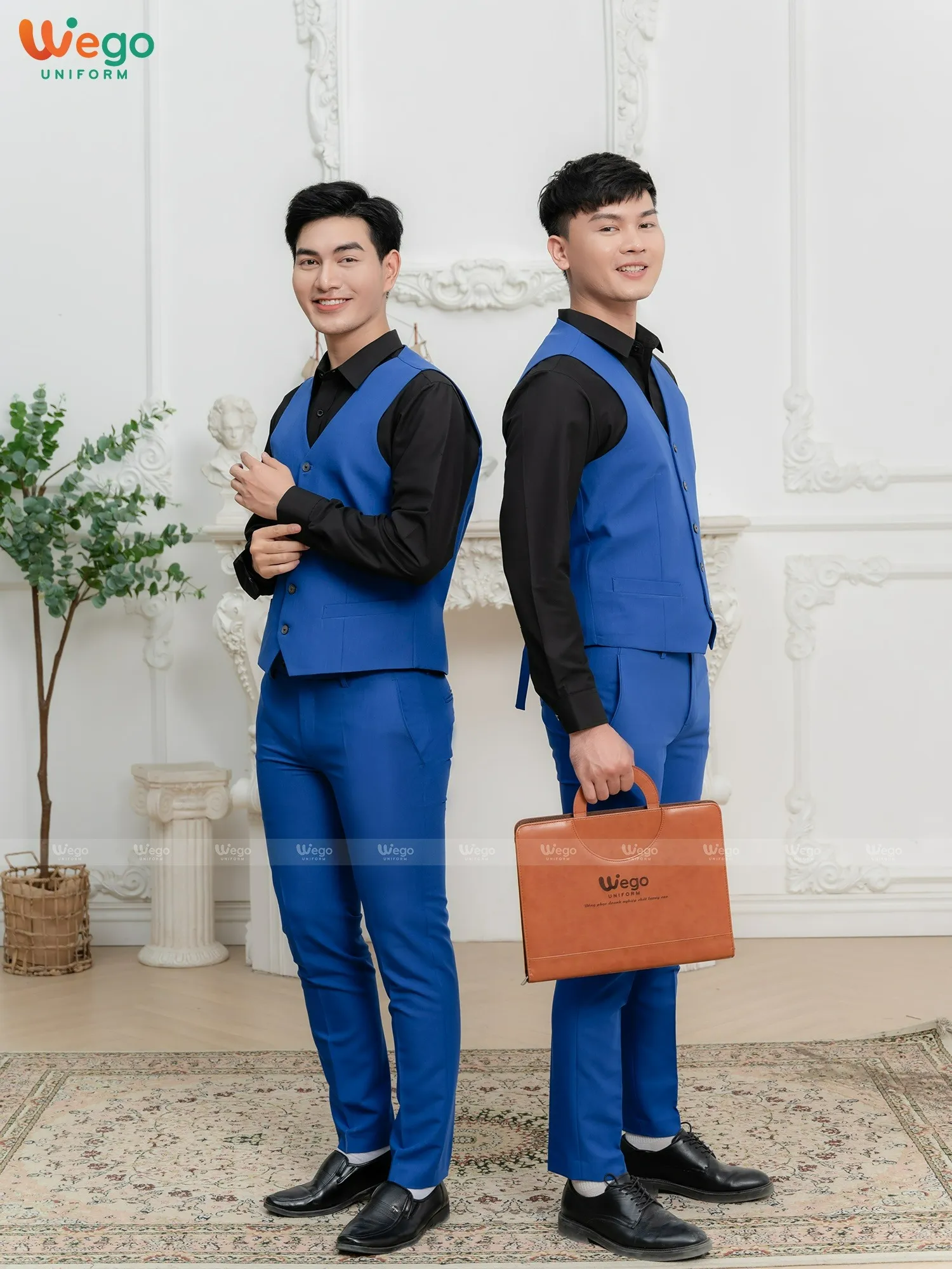 Bộ đồng phục vest nam gồm: Áo khoác vest, áo gile, áo sơ mi, và quần âu cùng bộ